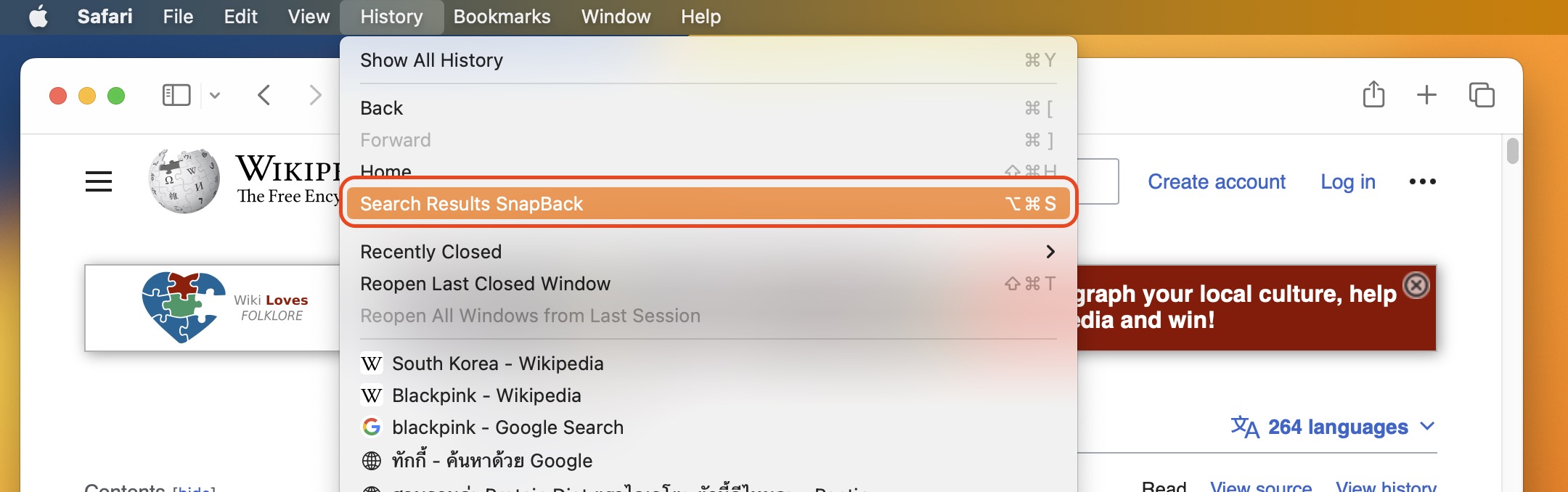 หลังจากที่เราท่องเว็บหลายหน้าต่างแล้ว เวลาที่เราอยากกลับไปยังผลลัพธ์การค้นหาแรก ก็สามารถคลิกเมนู History > เลือก Search Results SnapBack ได้เลย