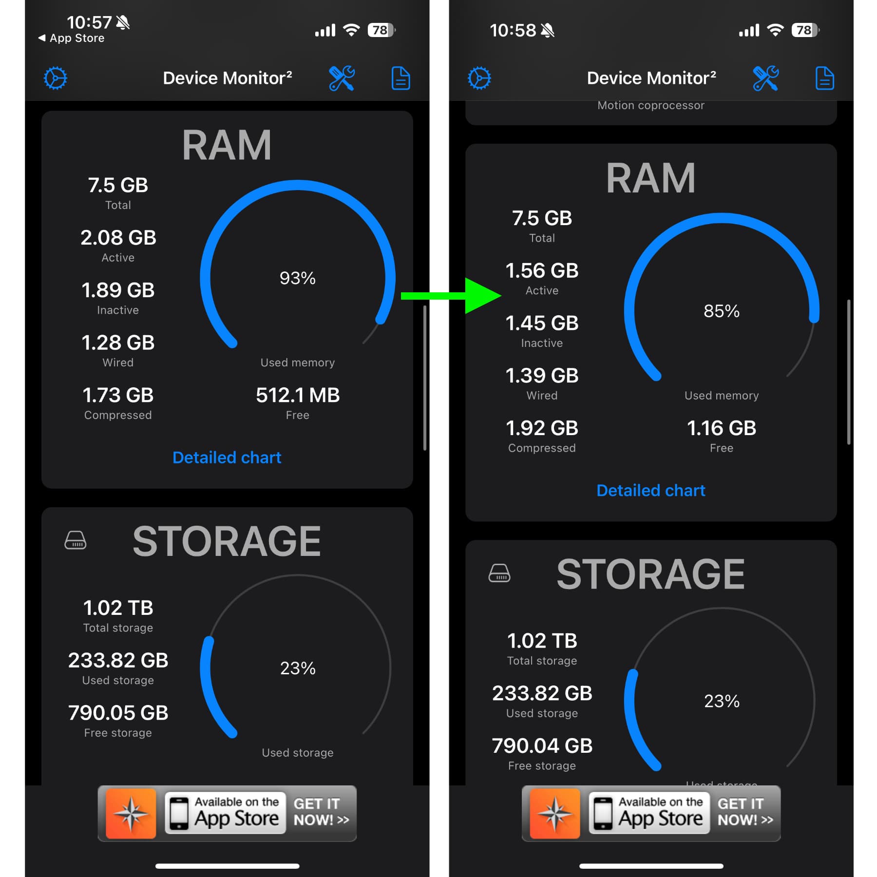 ทีมงานทดสอบโดยการโหลดแอป Device Monitor มาดูการทำงานของ CPU หลังจากที่เปิดและปิดแอปกล้อง จะเห็นได้ว่ามีการเคลียร์ RAM เกิดขึ้นจริง