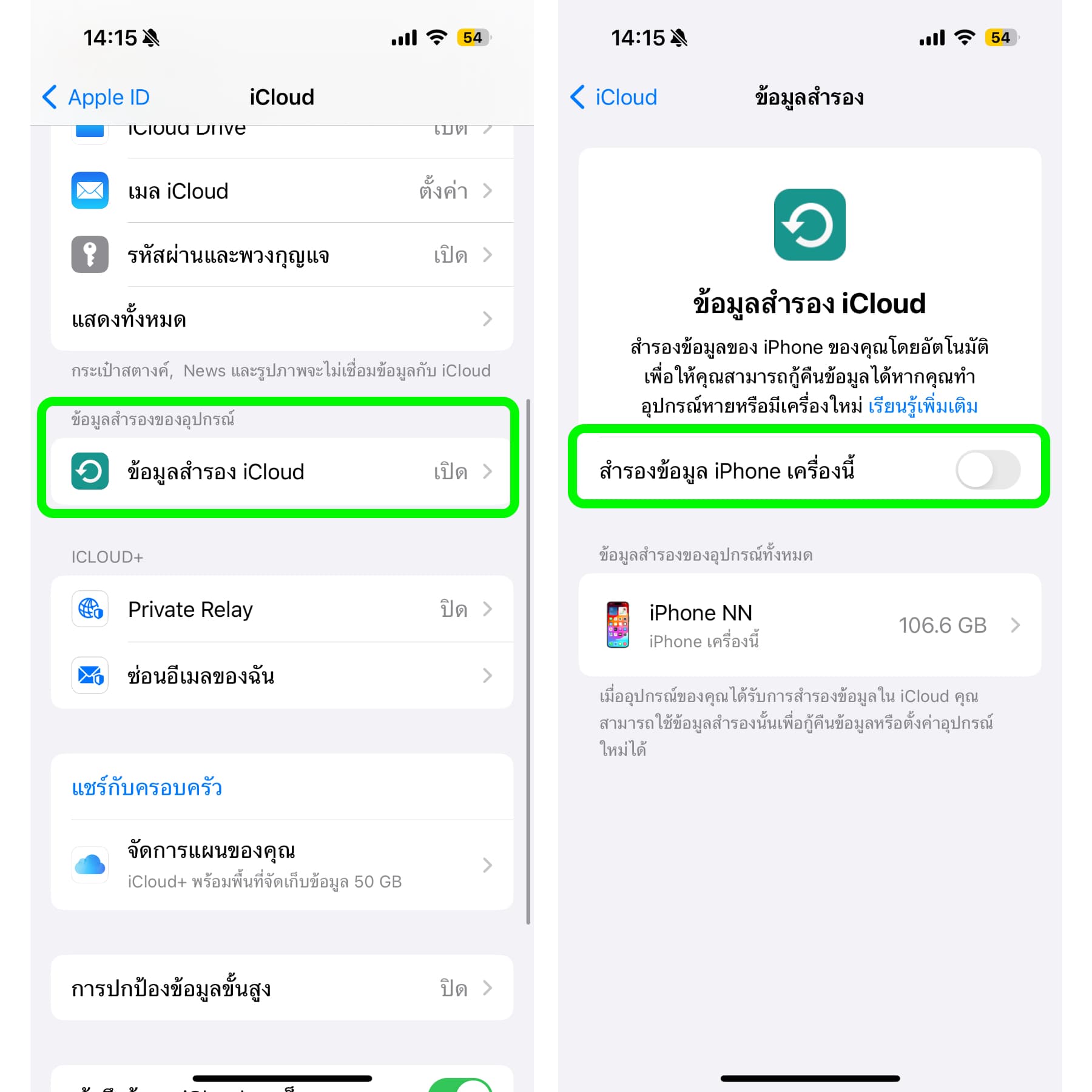 > ข้อมูลสำรอง iCloud > ปิด “สำรองข้อมูล iPhone เครื่องนี้”