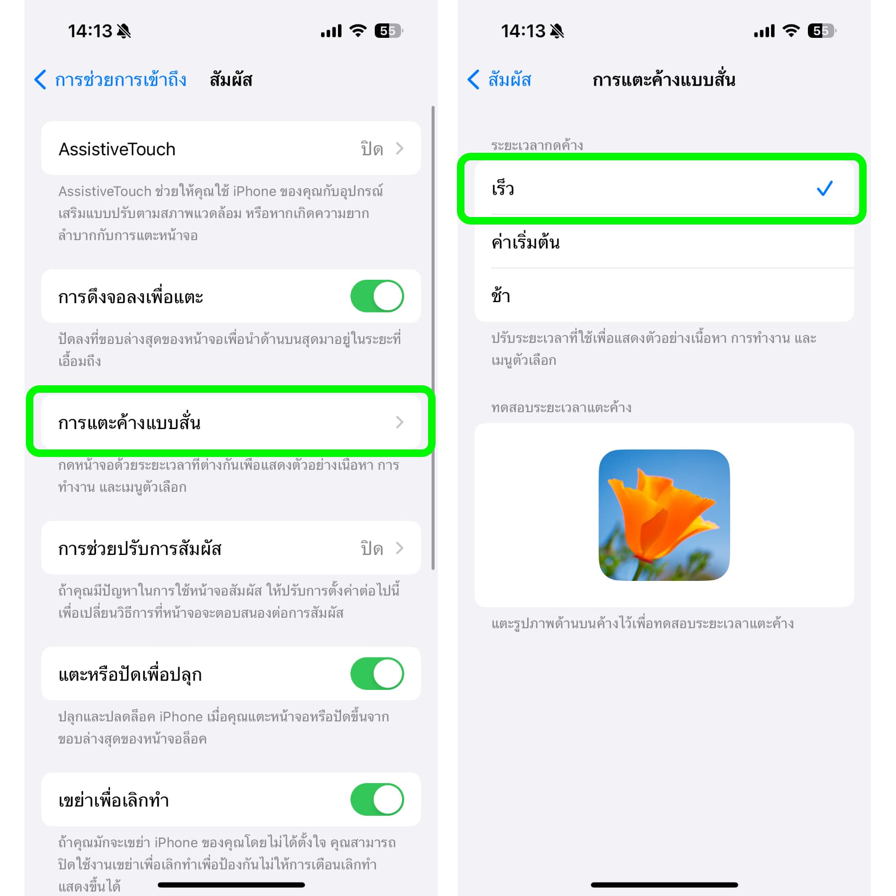 > การแตะค้างแบบสั่น > เลือกเป็นแบบ “เร็ว”