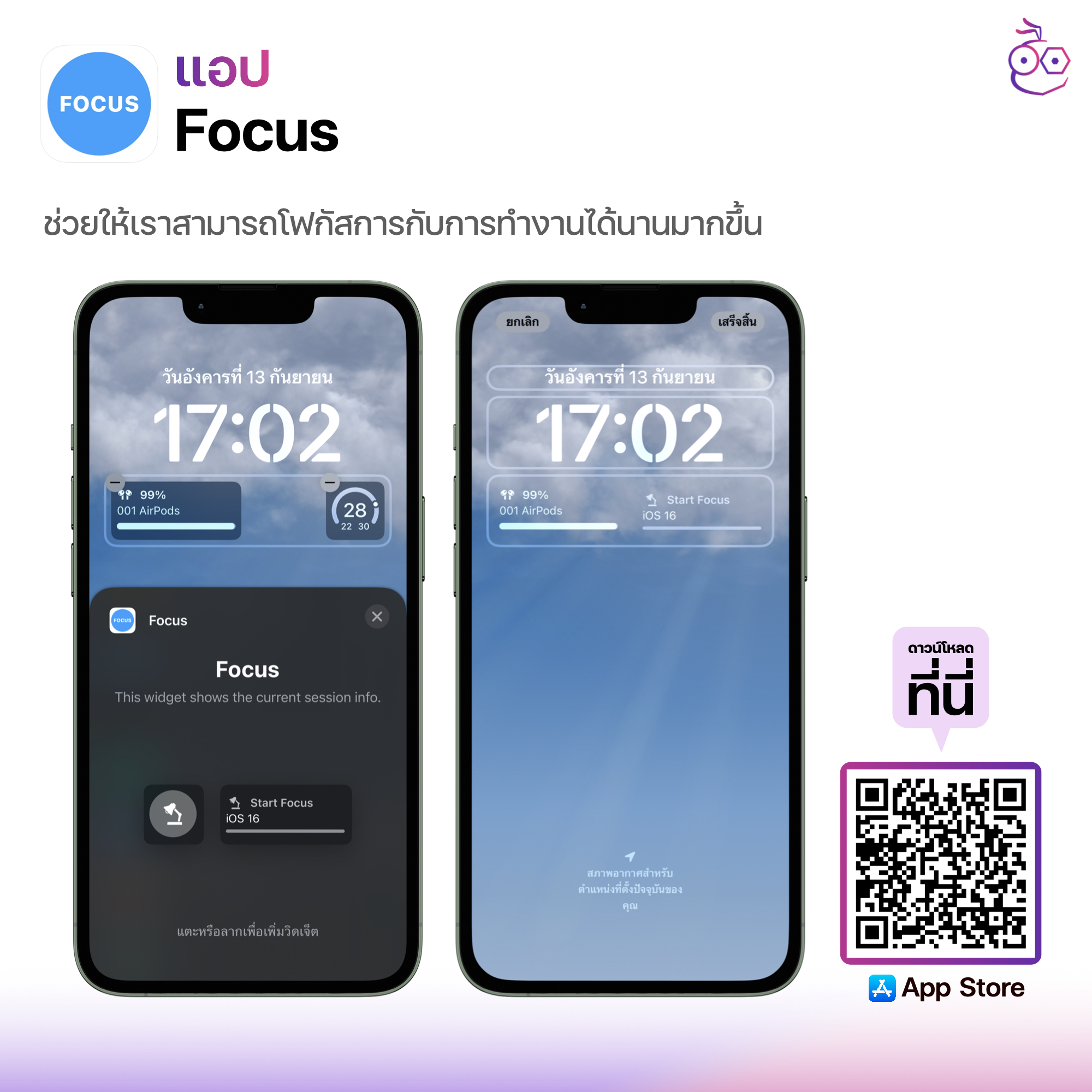แอป Focus เป็นแอปที่ช่วยให้เราสามารถโฟกัสการกับการทำงานได้นานมากขึ้น และที่สำคัญคือแอปนี้สามารถตั้งค่ารวมถึงตั้งเวลาเพื่อให้เรามีสมาธิจดจ่อกับกิจกรรมที่ทำอยู่ได้มากขึ้น ซึ่งสามารถตั้งเวลาของแต่ละหัวข้อโฟกัสได้ ซึ่งแน่นอนว่าแอปนี้สามารถนำไปตั้งค่าไว้บนหน้าจอ Lock Screen ของ iOS 16 ได้ด้วย