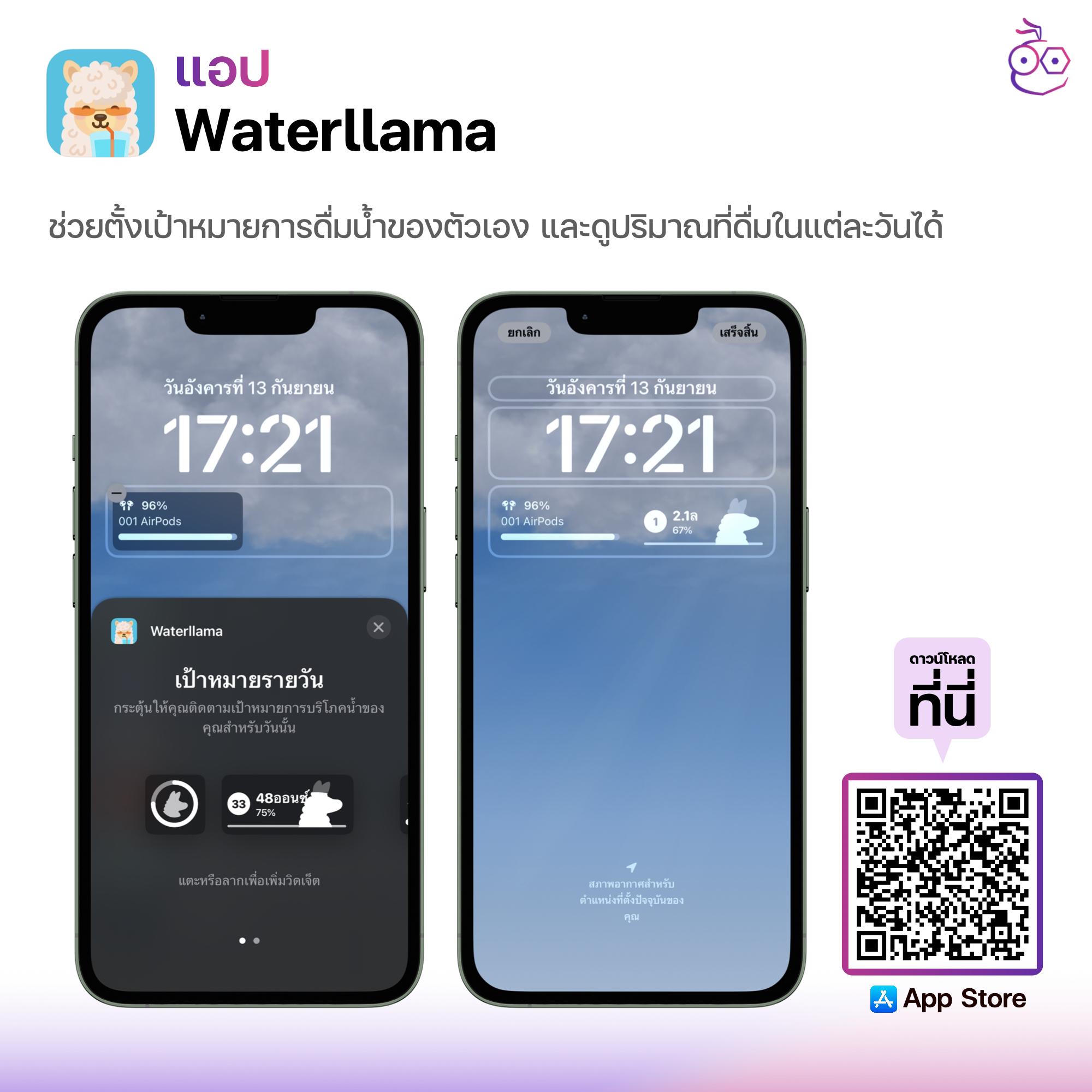 แอป Waterllama เป็นแอปช่วยให้เราสามารถตั้งเป้าหมายการดื่มน้ำเปล่าของตัวเองได้ สามารถตั้งค่าปริมาณน้ำในแต่ละวันได้ โดยหน้าตาของแอปก็จะน่ารัก ๆ ทำให้เรารู้สึกอยากดื่มน้ำมากขึ้น นอกจากนี้ก็ยังสามารถเพิ่มชนิดของเครื่องดื่มอื่น ๆ เข้าไปได้ด้วย (แต่ต้องซื้อเพิ่ม) ถ้านำไปตั้งวิดเจ็ตก็จะแสดงปริมาณน้ำที่เราดื่มไปในวันนี้