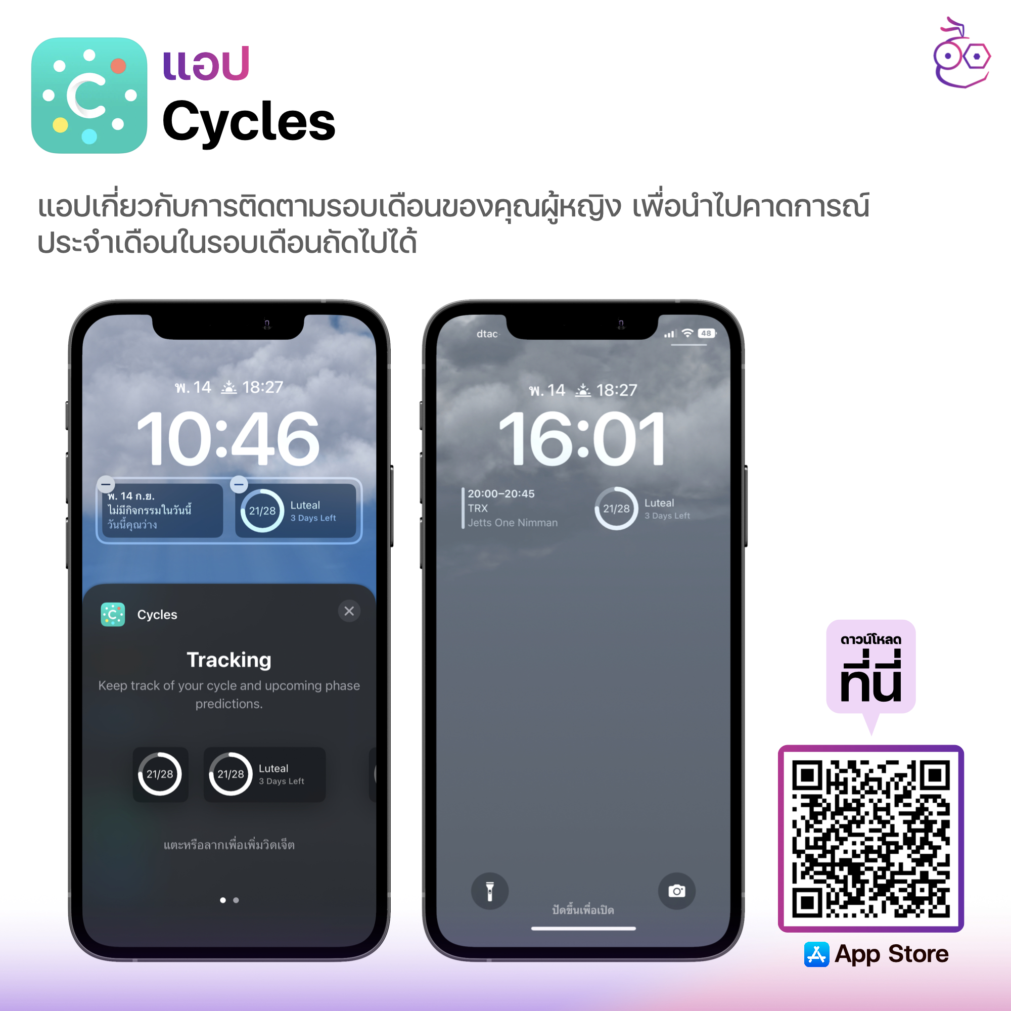 แอป Cycles เป็นแอปเกี่ยวกับการติดตามรอบเดือนของคุณผู้หญิง สามารถระบุรอบเดือน วันที่ประจำเดือนมา หรือวันที่ประจำเดือนหาย เพื่อนำไปคาดการณ์ประจำเดือนในรอบเดือนถัดไปได้ รวมถึงวิเคราะห์วันไข่ตกเพื่อนำไปวางแผนการมีครอบครัวได้เช่นกัน นอกจากนี้ยังสามารถเพิ่มการทานยา และวัดอุณหภูมิในร่างกายของเราได้อีกด้วย ถ้าหากนำไปตั้งค่าหน้าวิดเจ็ตก็จะระบุจำนวนวันนับถอยหลังสำหรับรอบเดือนถัดไปได้เลย