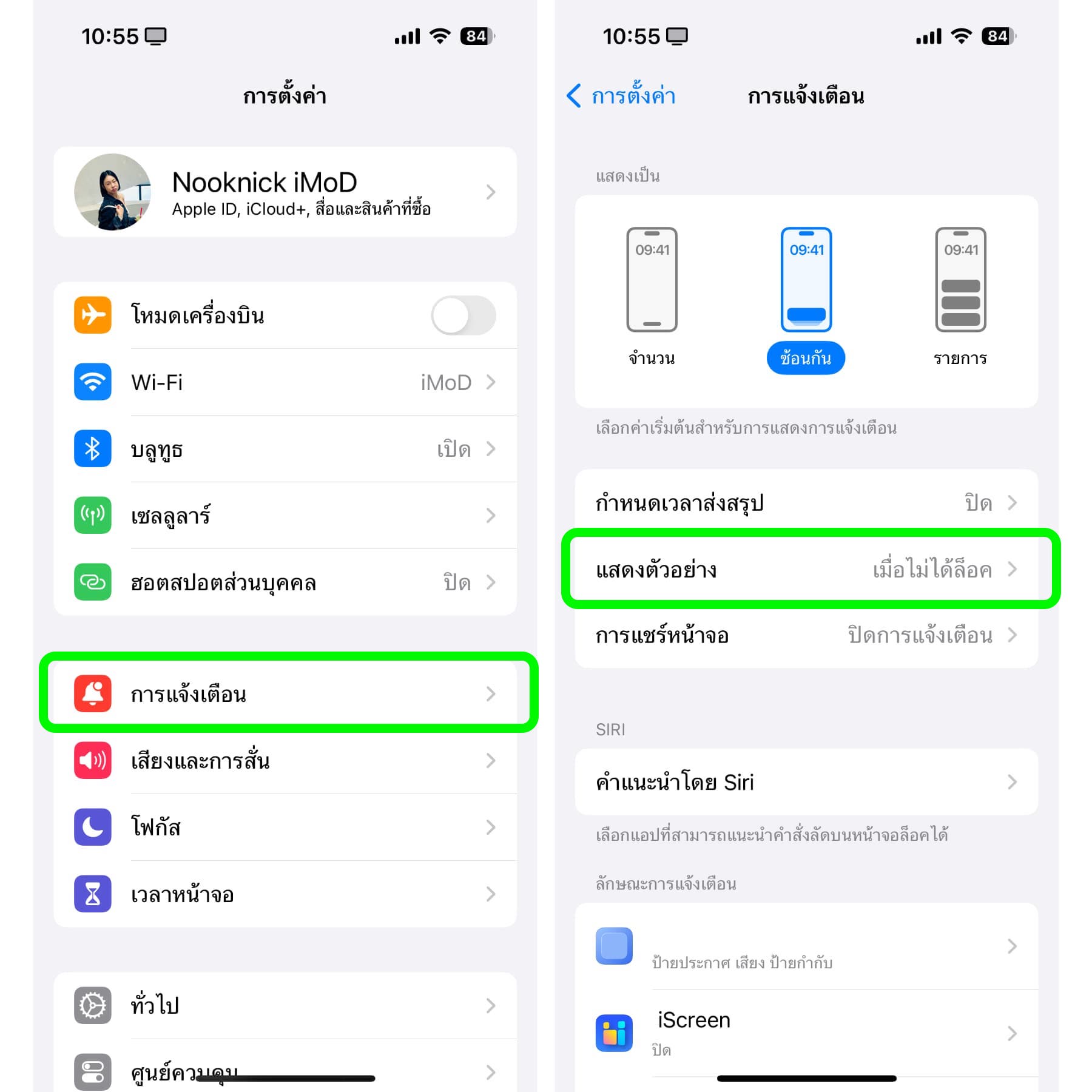เพิ่มความเป็นส่วนตัวมากขึ้น แนะนำให้ตั้งค่า การแสดงตัวอย่างการแจ้งเตือนเมื่อปลดล็อคแล้ว เพื่อให้ไม่มีใครเห็นเนื้อหาของการแจ้งเตือนโดยไม่ปลดล็อก iPhone