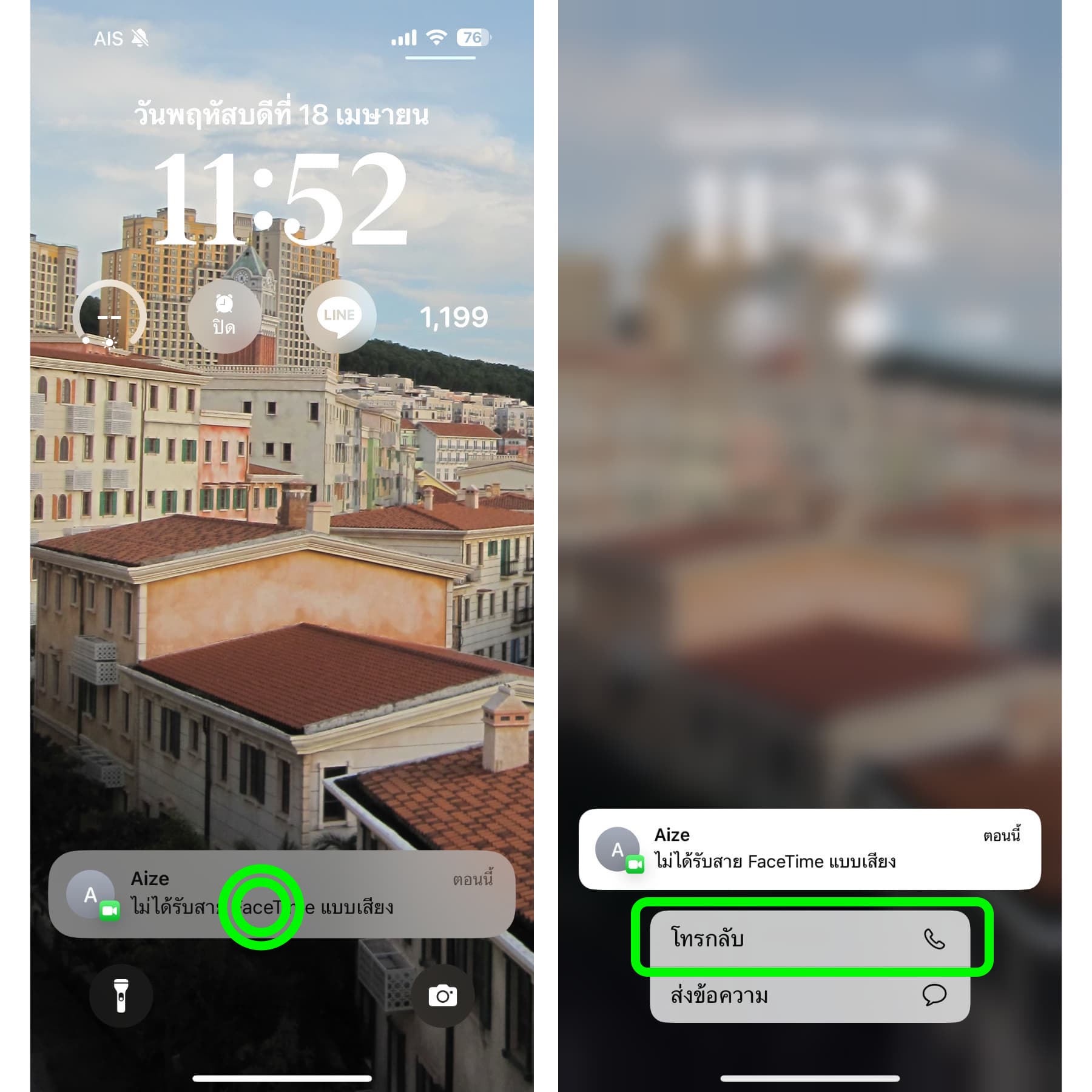 หากมีคนโทรเข้ามาแล้วคุณไม่ทันได้รับสาย คุณสามารถโทรกลับไปได้เลยจากหน้าจอล็อก เพียงแตะค้างที่การแจ้งเตือนสายที่ไม่ได้รับ > แตะที่ “โทรกลับ” ได้เลย (ไม่มีการถามยืนยันก่อนโทรออก จะโทรออกให้ทันที)