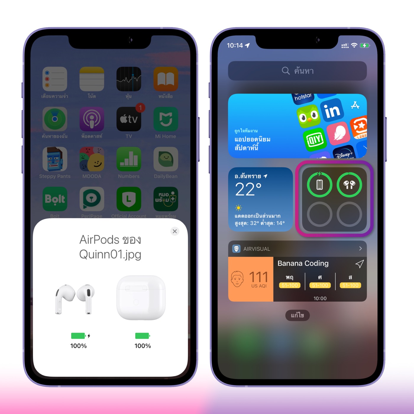 - จะขึ้นแสดงสถานะแบตเตอรี่หูฟัง และ เคส ที่หน้าจอ iPhone