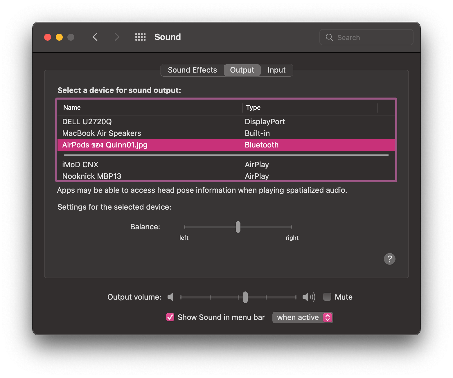 ดูว่าได้เลือกบลูทูธเป็นอุปกรณ์ที่จะให้เสียงออกมา ปกติแล้วจะถูกเลือกอัตโนมัติ เพราะ AirPods จะตรวจจับได้ว่าเรากำลังใส่หูฟังอยู่ แต่ในบางครั้งก็อาจจะไม่จับคู่ให้ ให้ลองทำตามนี้
