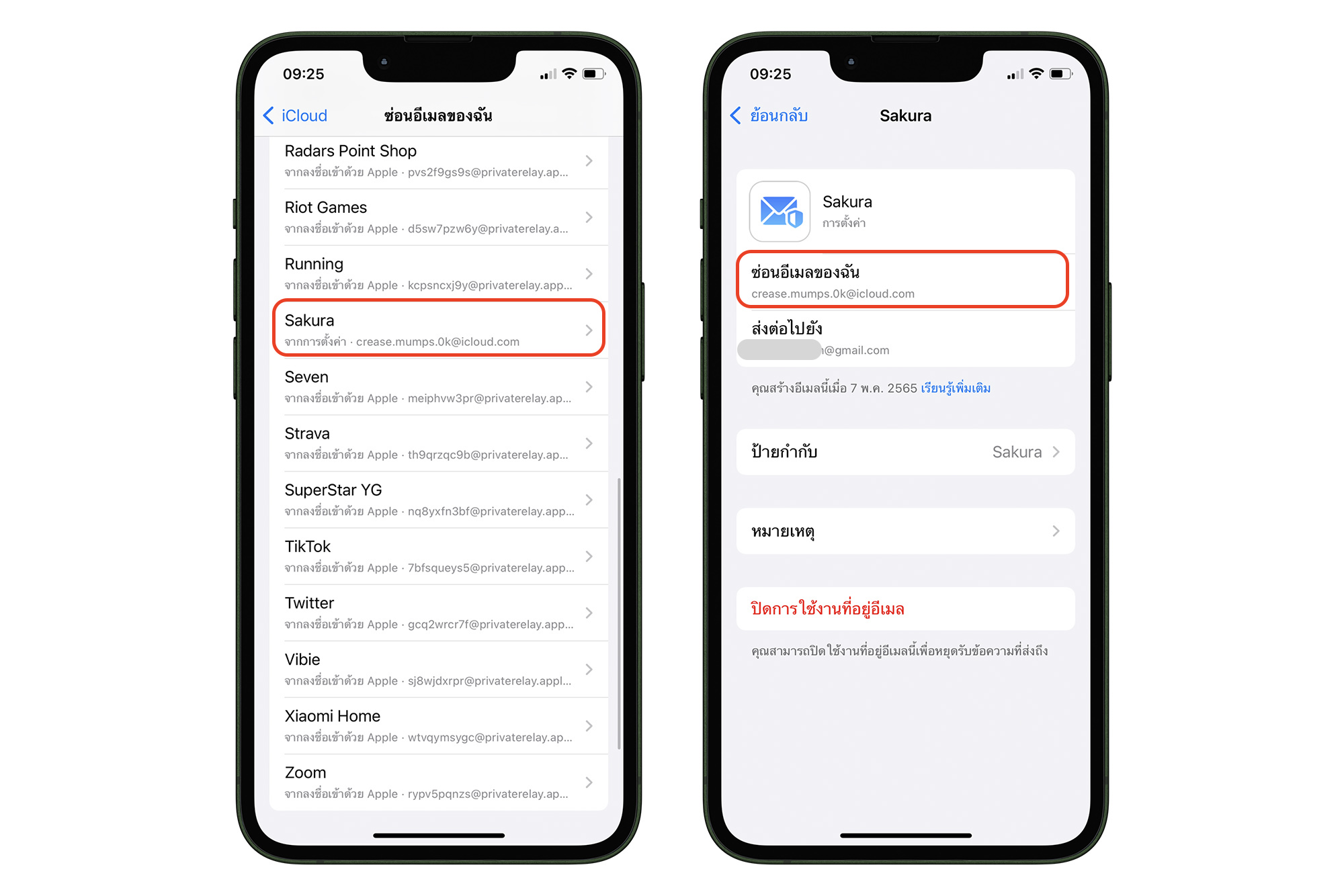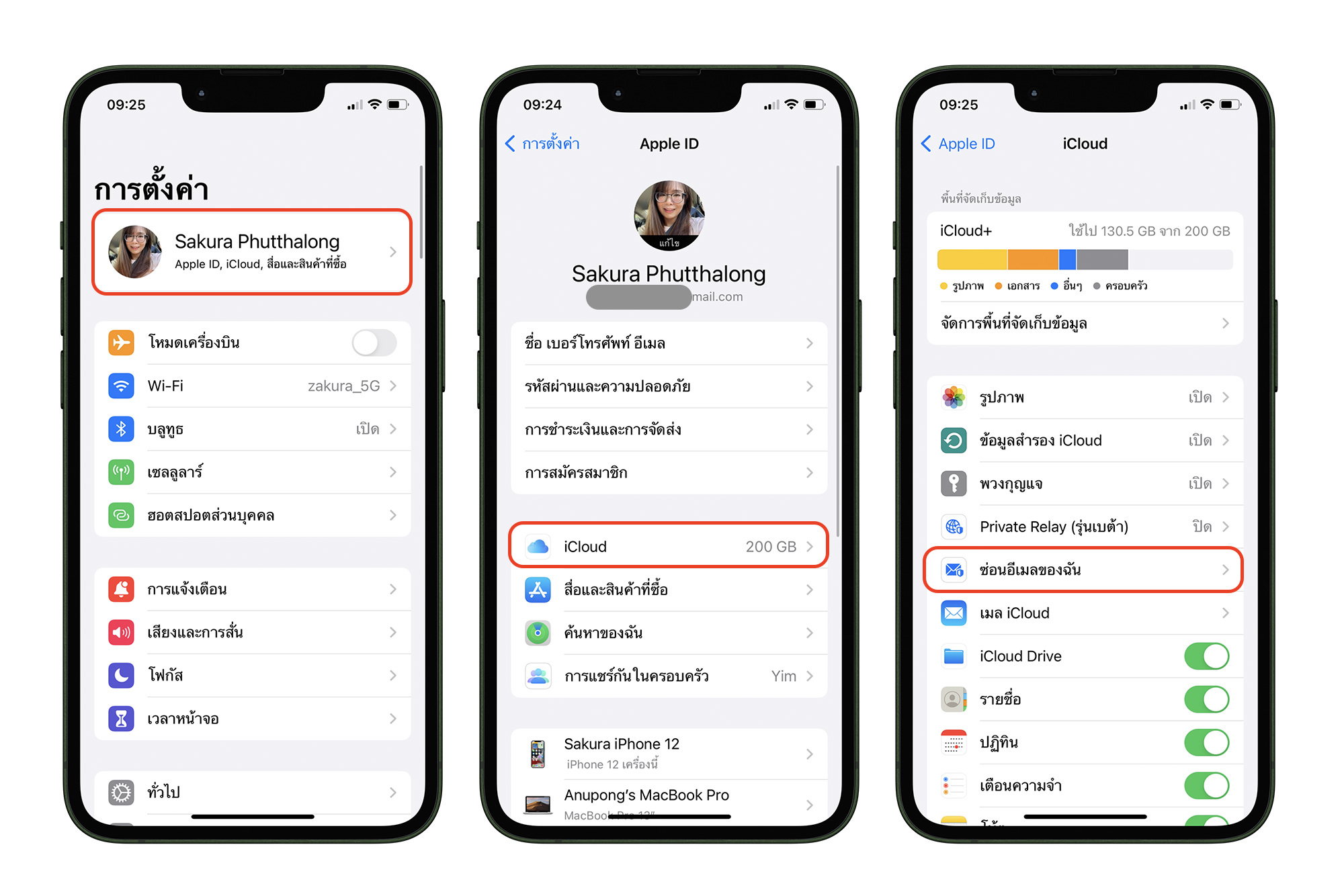 ตั้งค่าได้ที่ การตั้งค่า (Settings) > Apple ID > แตะ iCloud > ซ่อนอีเมลของฉัน