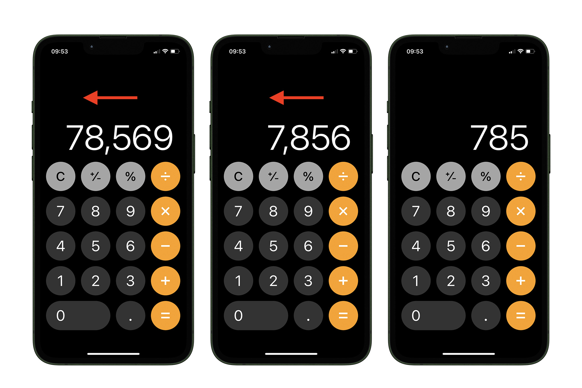 เคล็ดลับง่าย ๆ ในแอปเครื่องคิดเลขบน iPhone สำหรับคนที่พิมพ์ตัวเลขผิดพลาด แต่แทนที่เราจะแตะตัว C เพื่อลบตัวเลขทั้งหมด แต่เราสามารถลบตัวเลขตัวสุดท้ายทีละ 1 ตัวได้ง่าย ๆ เพียงปัดในส่วนตัวเลข