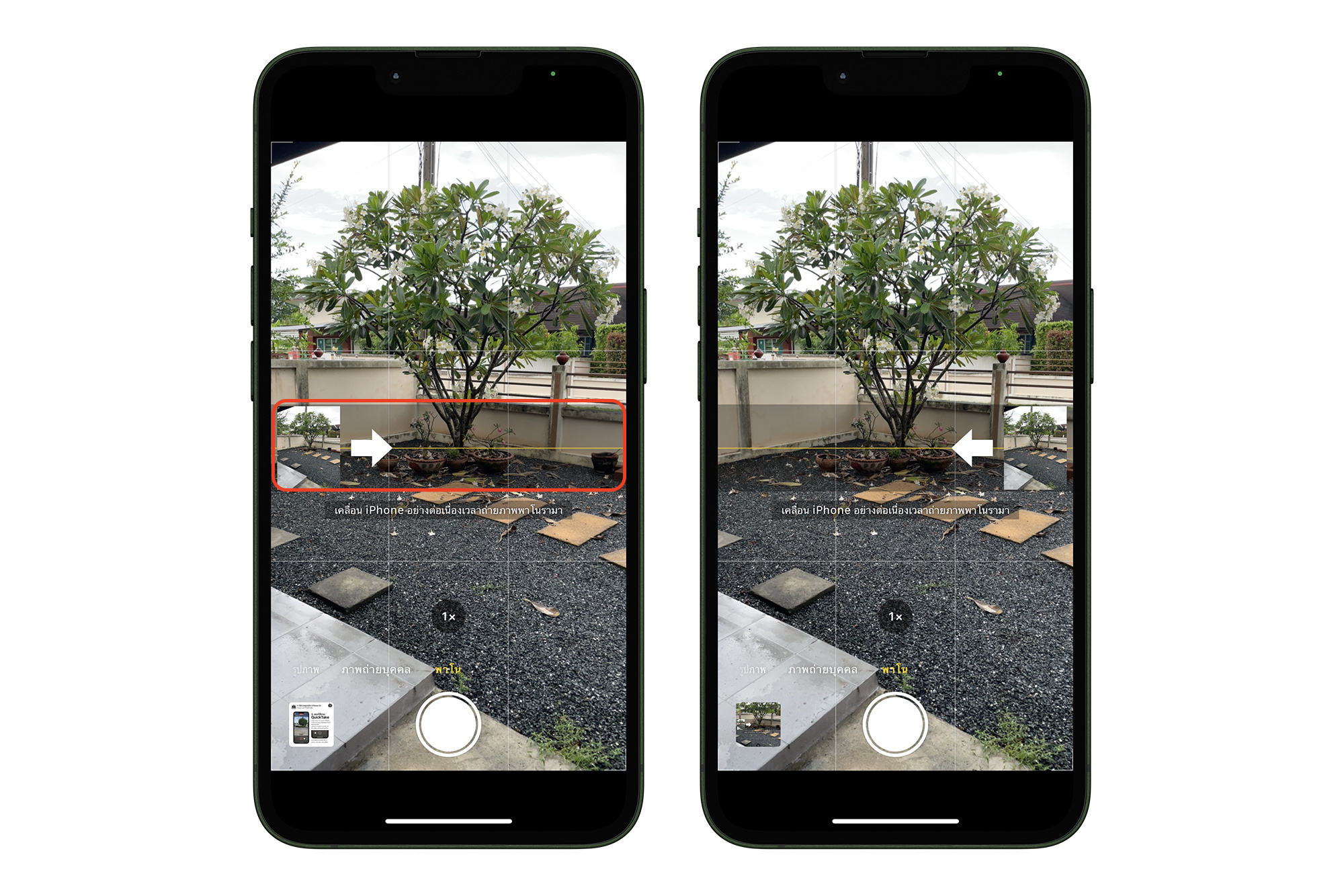 ปกติแล้วการถ่ายภาพพาโนราคาจากกล้อง iPhone แอปจะเริ่มต้นจากการถ่ายด้านซ้ายเลื่อนไปทางด้านขวา แต่ถ้าใครอยากจะลองเปลี่ยนให้ถ่ายจากทางด้านขวามาด้านซ้าย ก็ลองแตะส่วนที่แสดงพาโนตามวงสีแดงได้เลย การถ่ายภาพก็จะสลับด้านทันที