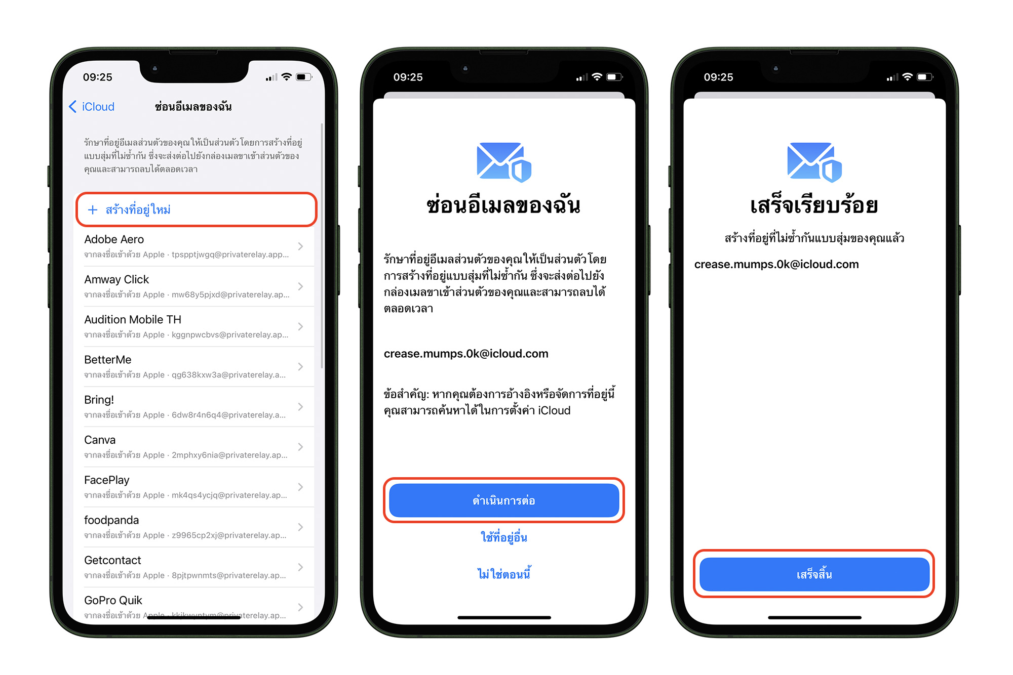 เราจะพบกับอีเมลที่ใช้ Sign in with Apple ID หากต้องการสร้างอีเมลแบบสุ่มใหม่ ให้แตะ สร้างที่อยู่ใหม่ > iCloud ก็จะสร้างอีเมลสุ่มมาให้เรา แตะ ดำเนินการต่อ > แตะเสร็จสิ้น