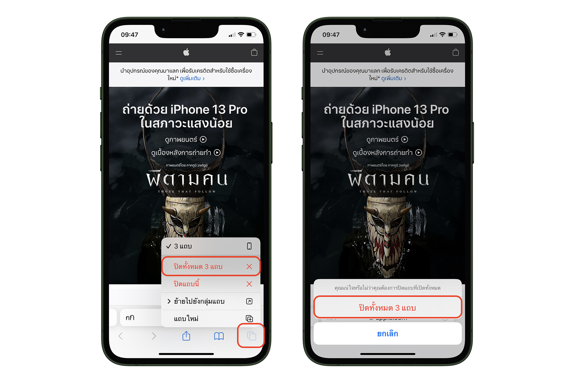 ใครที่ท่องเว็บบน Safari จนเปิดแถบทิ้งไว้มากมาย จะมาไล่ปิดทีละแถบก็เสียเวลา เราสามารถแตะค้างที่ไอคอนแถบด้านล่างขวา จากนั้นเลือก ปิดแถบทั้งหมด ได้เลย แถบก็จะถูกปิด เพียงแค่แตะครั้งเดียว