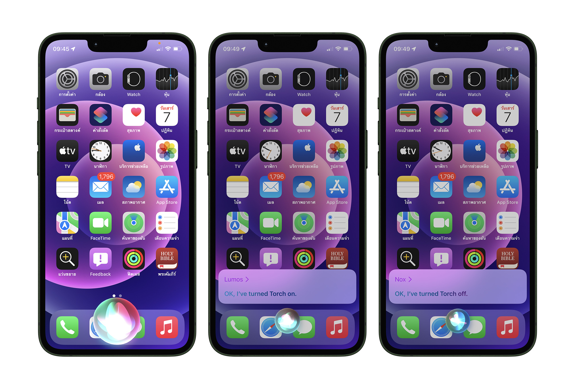 เราสามารถพูดคาถาจาก Harry Potter สั่งให้ Siri เปิดหรือปิดไฟฉายได้ เพียงแค่เรียก Siri และพูดว่า “Lumos” (ลูมอส) ไฟฉายก็จะเปิดทันที และถ้าพูดว่า “Nox” (นอกซ์) ไฟฉายก็จะปิดใช้งาน