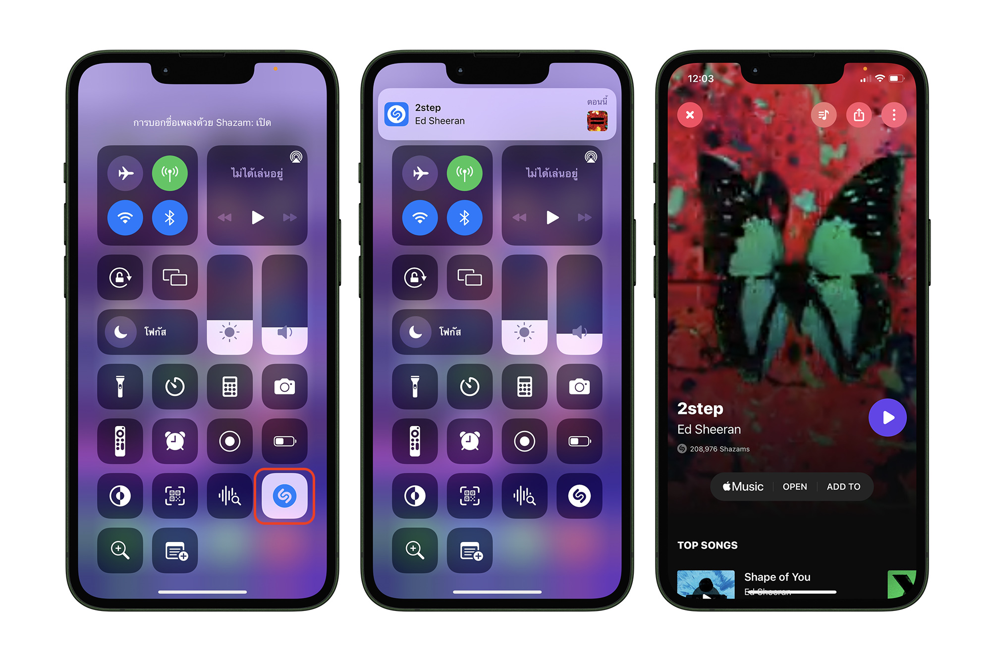 เพื่อให้ Shazam ช่วยฟังเสียงเพลงที่กำลังเล่นอยู่รอบข้าง และตอบกลับมาว่าเพลงที่เล่นอยู่มีชื่อเพลงว่าอะไร แต่อย่าลืมไปเพิ่มไอคอน Shazam ให้มาแสดงที่ Control Center ในส่วนการตั้งค่าด้วยนะค [ชมวิธีตั้งค่า Control Center]