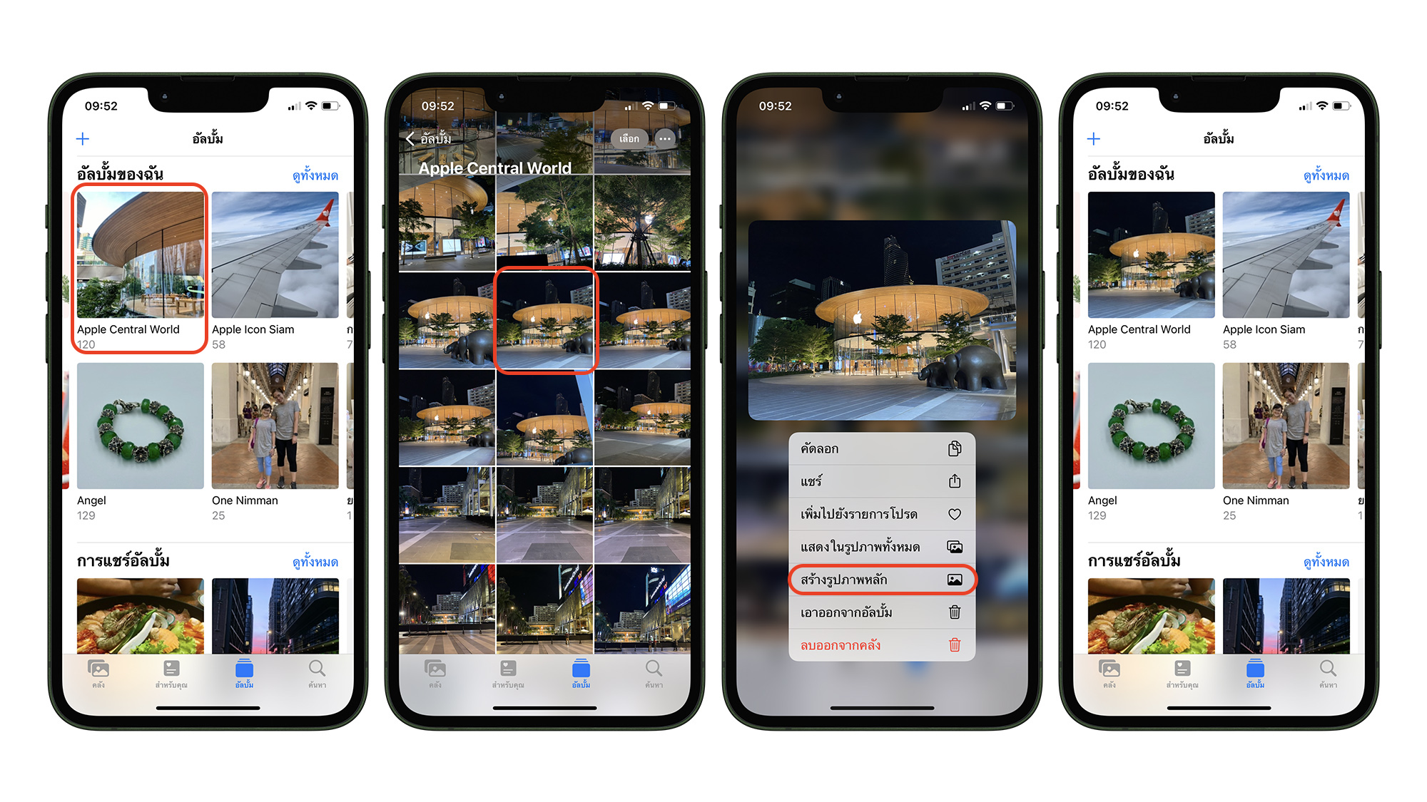ไปที่ แอป Photos > อัลบั้ม > เลือกรูปภาพที่ต้องการทำให้เป็นหน้าปกอัลบั้ม จากนั้นก็แตะค้างที่รูป แล้วเลือก “สร้างรูปภาพหลัก” (Make Key Photo.) หน้าปกอัลบั้มก็จะเปลี่ยนเป็นรูปที่เราเลือก