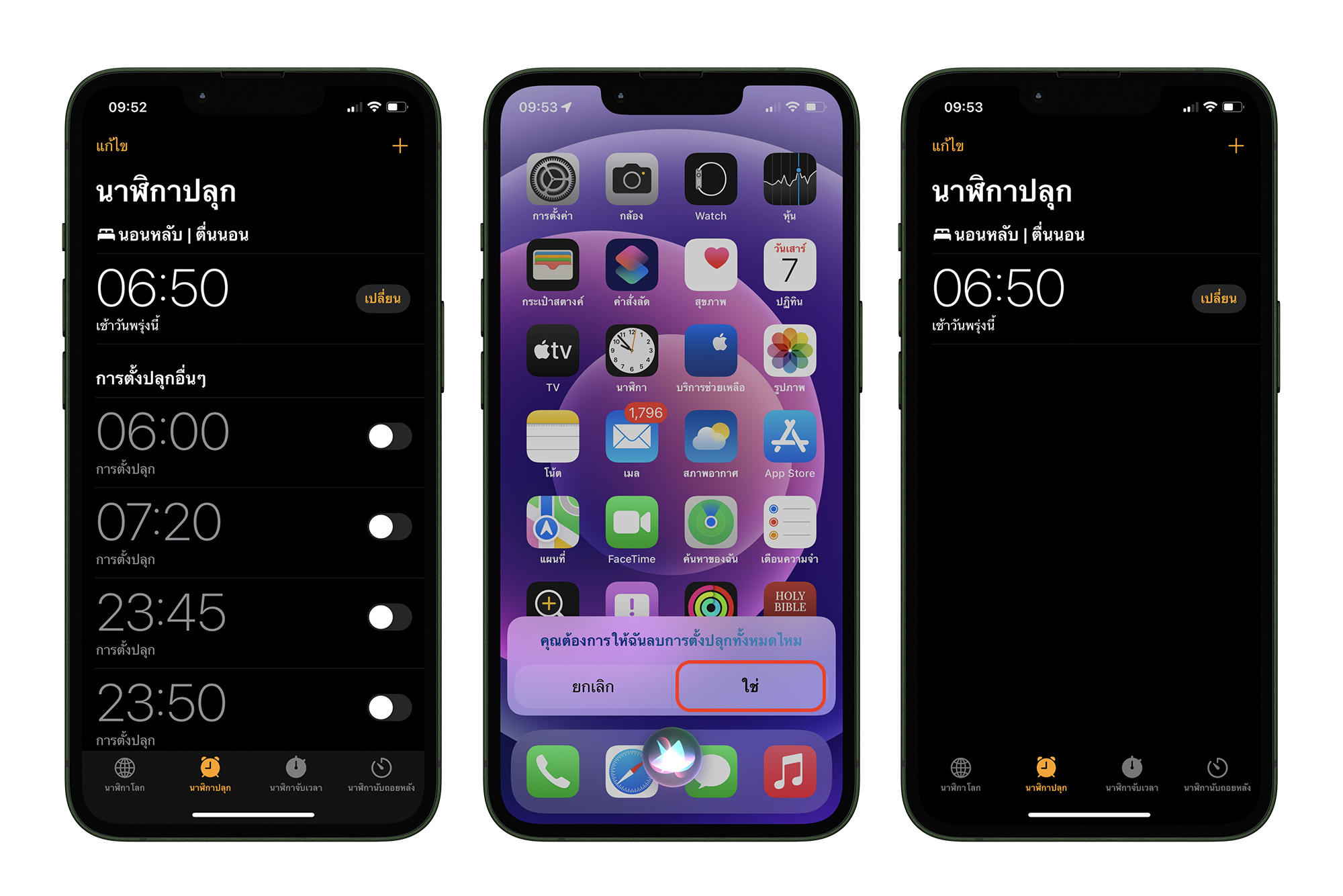 เราสามารถสั่งเลขาส่วนตัวอย่าง Siri ให้สร้างเวลาการปลุกได้ แน่นอนว่าเราก็สามารถสั่งให้ Siri ลบการปลุกได้ด้วยเช่นกัน แค่เรียก Siri ขึ้นมาแล้วพูดว่า “ลบการปลุกทั้งหมด” และยืนกันการลบ
