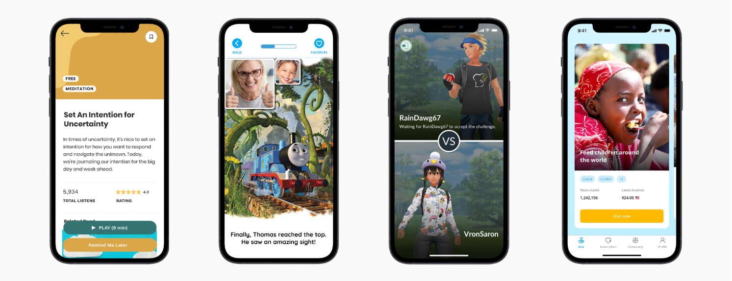 แอปเป็นภาพสะท้อนของวัฒนธรรม และในปี 2020 นักพัฒนาก็ได้นำเทรนด์ไปสู่แอปช่วยเหลือกันอย่างมากมายเพื่อช่วยให้ผู้ใช้งานสามารถดูแลตัวเองในแต่ละวันได้อย่างที่ต้องการ และเพื่อเน้นการสร้างความเป็นอยู่ที่ดีของคนผิวดำ Shine ได้เปิดตัวเซ็คชั่นที่อุทิศให้แก่เรื่องสุขภาพจิตและชีวิตที่ดีของคนผิวดำโดยเฉพาะ ส่วนสำหรับครูและนักเรียนที่ต้องการสร้างประสบการณ์ใหม่ของห้องเรียน Explain Everything Whiteboard ก็นำเสนอเครื่องมือการทำงานร่วมกันบนคลาวด์ เพื่อให้กลุ่มนักเรียนสามารถทำโปรเจ็คท์ร่วมกันได้ แม้จะอยู่ไกลกันก็ตาม สำหรับครอบครัวที่มองหาการเชื่อมต่อกับคนที่รัก Caribu ก็ได้เพิ่มเกมอินเทอร์แอคทีฟจำนวนมาก และหนังสือกว่าร้อยเล่มไว้ในแพลตฟอร์มวิดีโอคอลแบบเรียลไทม์ของแอป ส่วน Pokémon GO ก็ได้นำเอาเกมยอดนิยมของตัวเองที่เคยเล่นนอกสถานที่ มาสร้างประสบการณ์ใหม่ในการเล่นที่บ้าน แอป ShareTheMeal ของโครงการอาหารโลกของสหประชาชาติ ก็ทำให้ผู้ใช้สามารถสร้างความแตกต่างให้แก่ชีวิตของผู้อื่นได้ง่ายขึ้น ด้วยมื้ออาหารมากกว่า 87 ล้านมื้อที่แบ่งปันกันอยู่ในทุกวันนี้ นักพัฒนาแอปจากทั่วทุกมุมโลกต่างก็นำเอาพลังสร้างสรรค์ของตนเอง มาใช้ไปกับการช่วยเหลือให้ผู้ใช้งานได้รักษาสุขภาพให้แข็งแรง ได้เรียนรู้ ได้เชื่อมต่อกับผู้อื่น และได้รับความเพลิดเพลิน