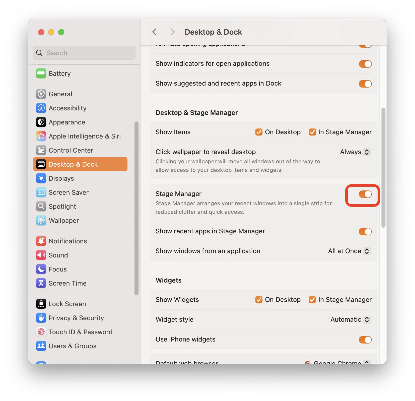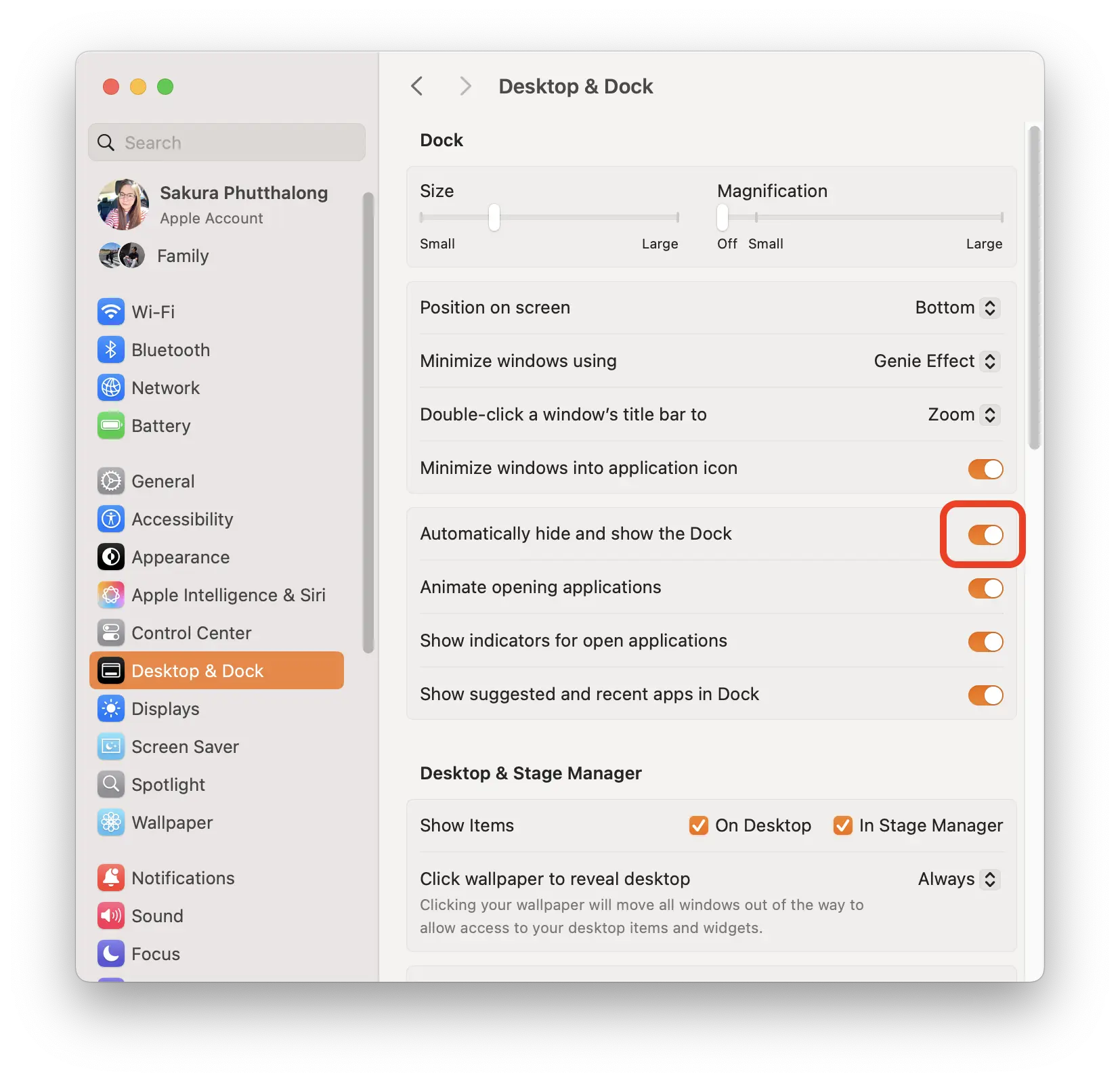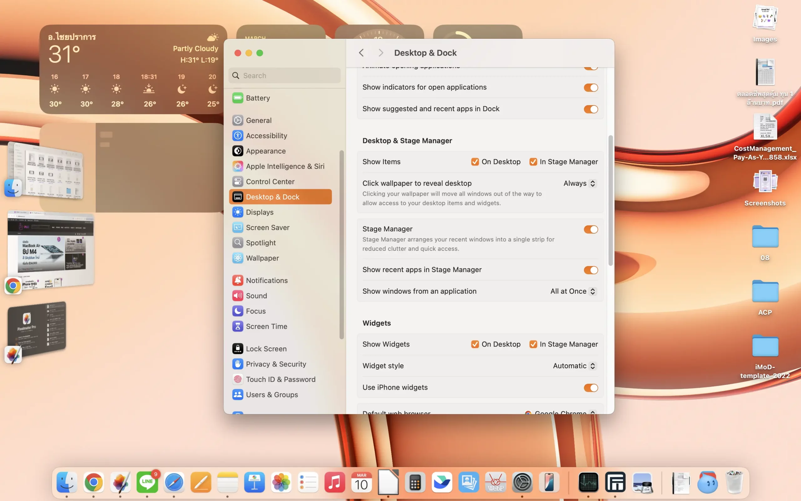 ไปที่ System Settings > Desktop & Dock > เปิด Stage Manager