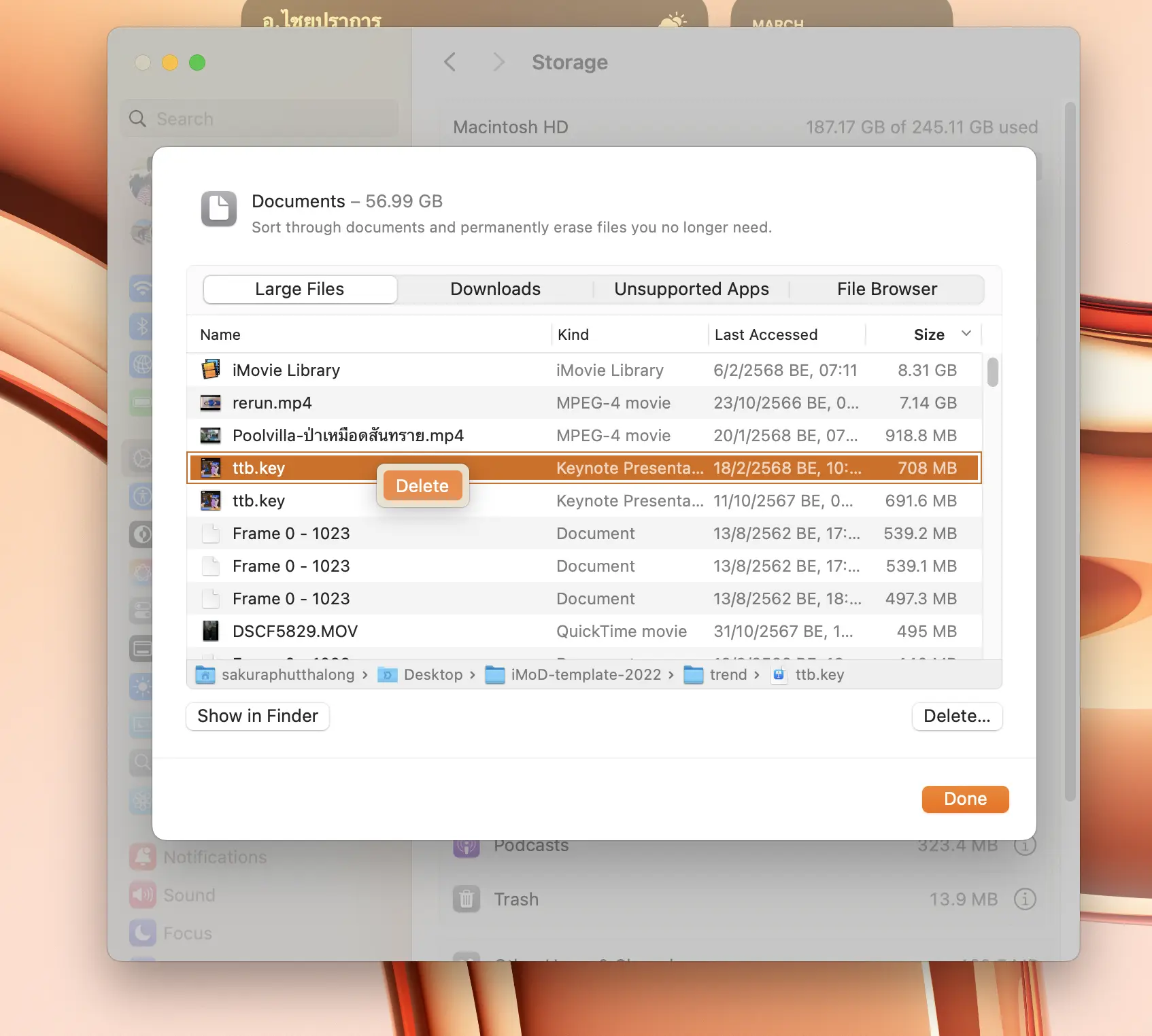 ดังนั้น ถ้าหากเราพอดีเวลา ก็อาจจะเข้าไปดูในโฟลเดอร์ Applications ว่ามีแอปอะไรที่เราไม่ได้ใช้แล้วบ้าง ก็สามารถลบออกได้เลย รวมถึงไฟล์และโฟลเดอร์ที่ไม่เกี่ยวข้องด้วย เพื่อทำให้พื้นที่บน Mac ของเรากลับมา