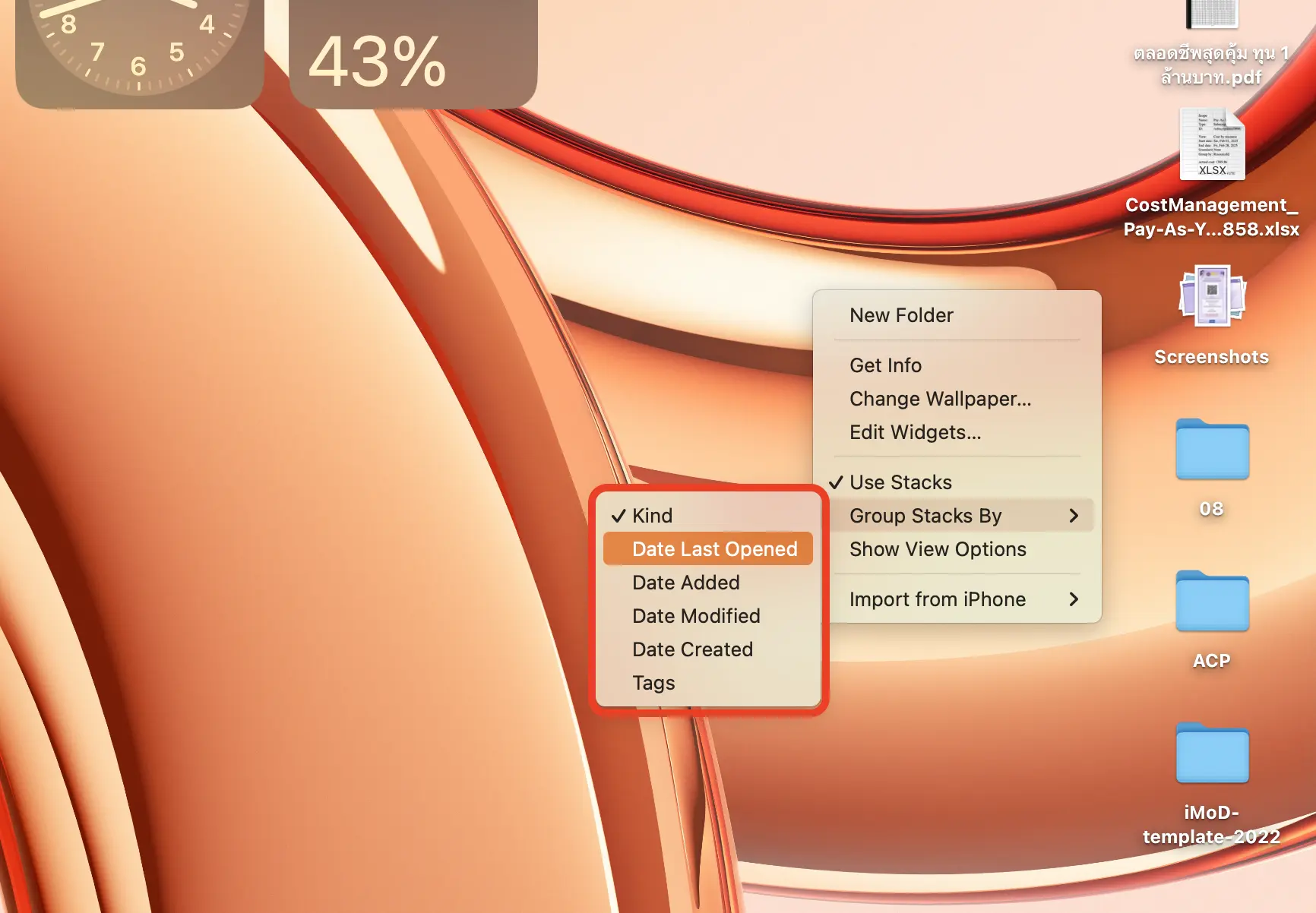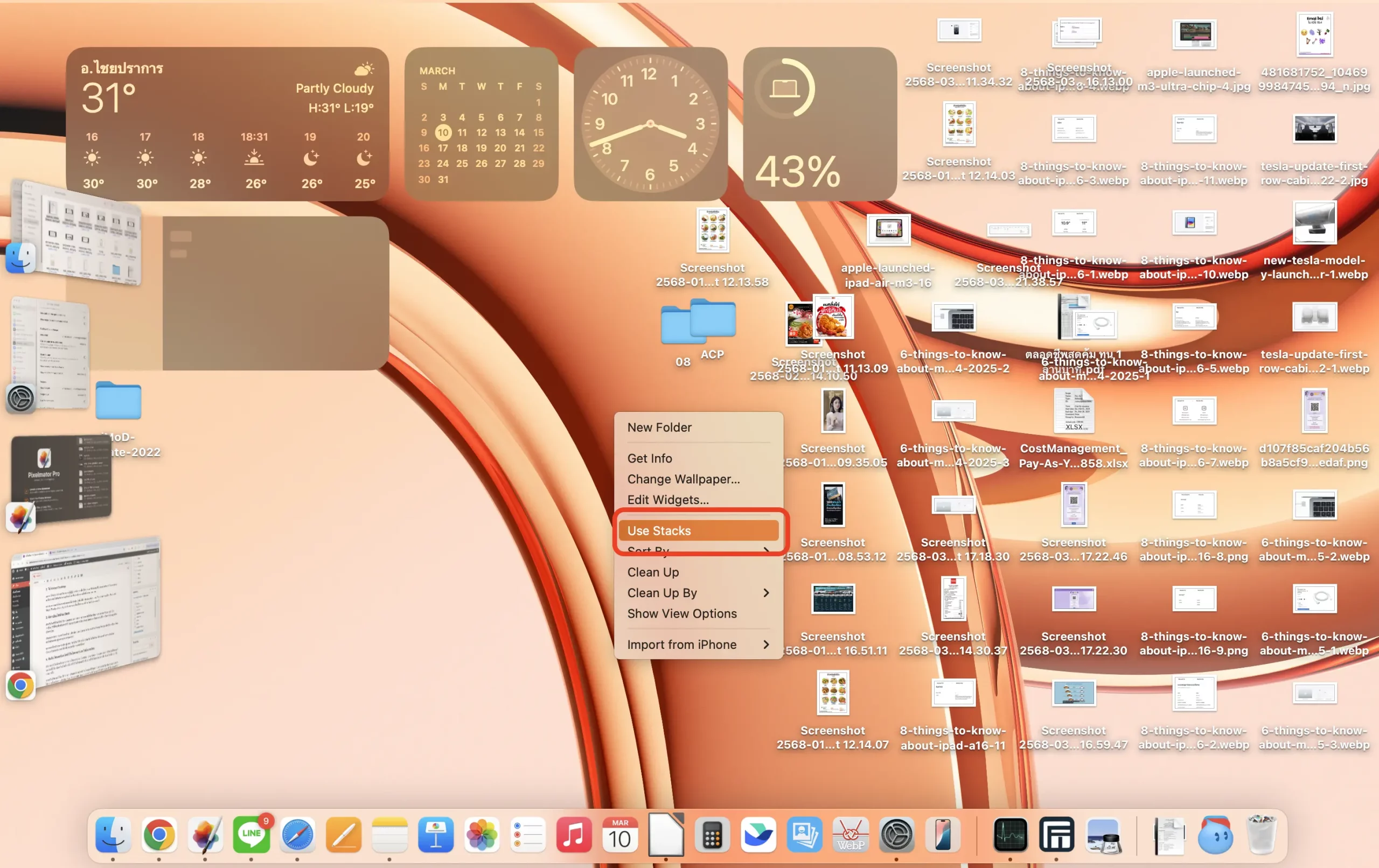 เพียงแค่ คลิกขวา บนหน้าเดสท็อป แล้วเลือก Use Stacks ไฟล์บนเดสท็อปก็จะถูกจัดกลุ่มอย่าเป็นระเบียบ โดยค่าเริ่มต้นจะจัดกลุ่มตามประเภทของไฟล์