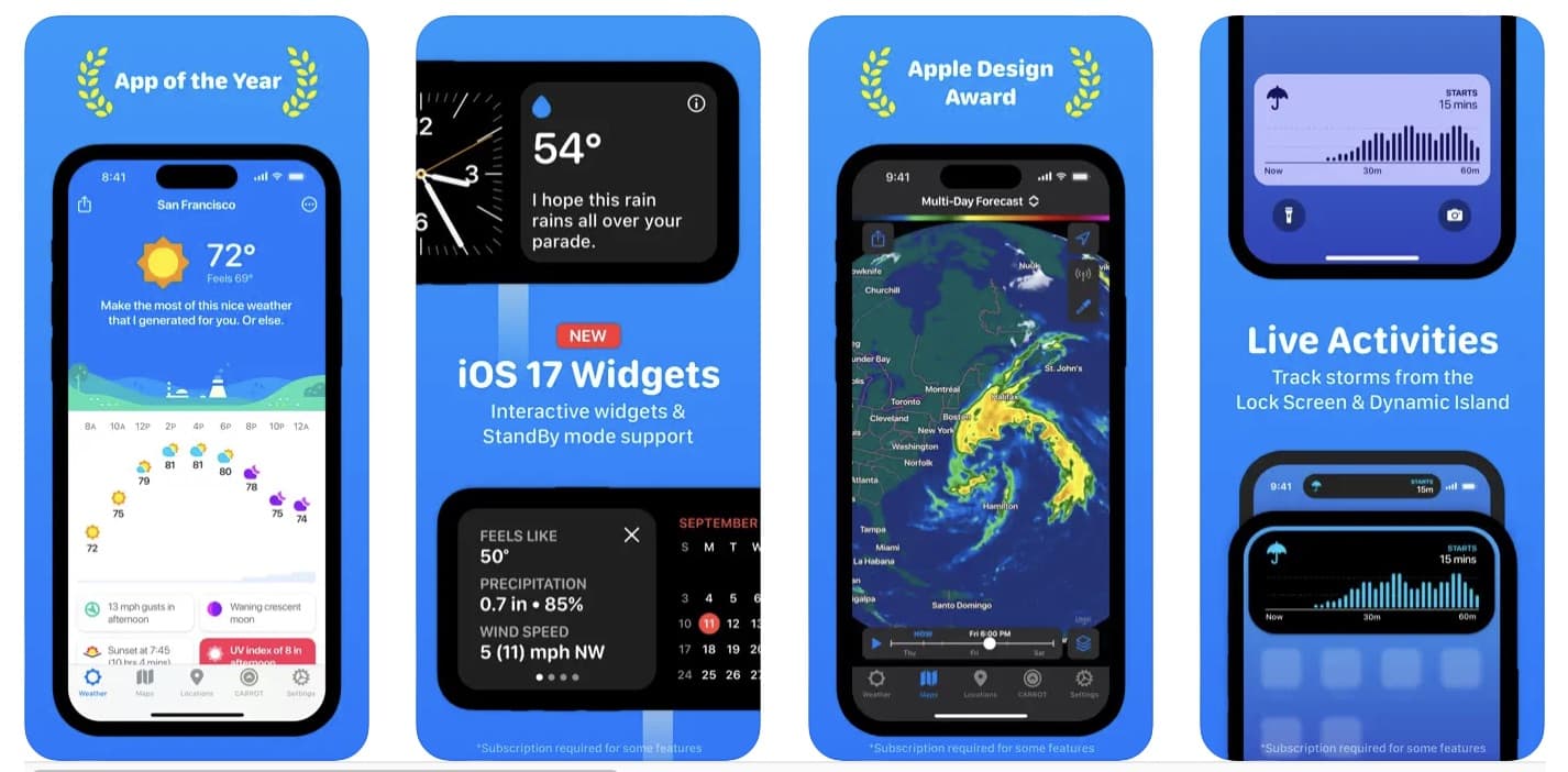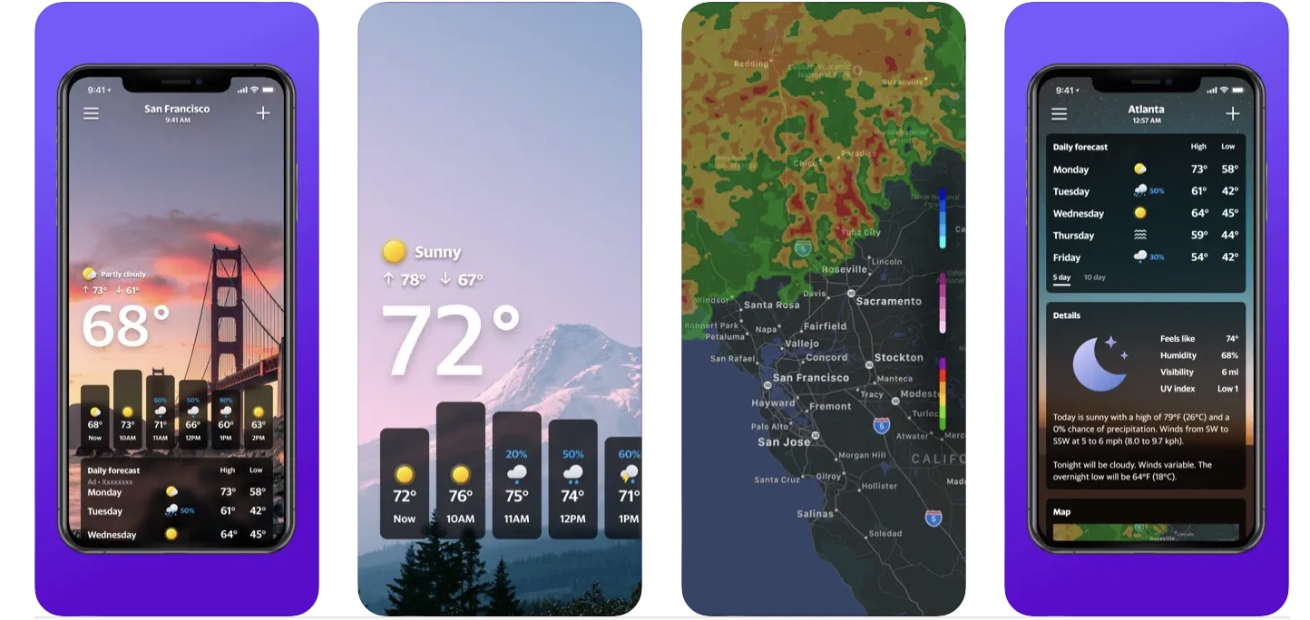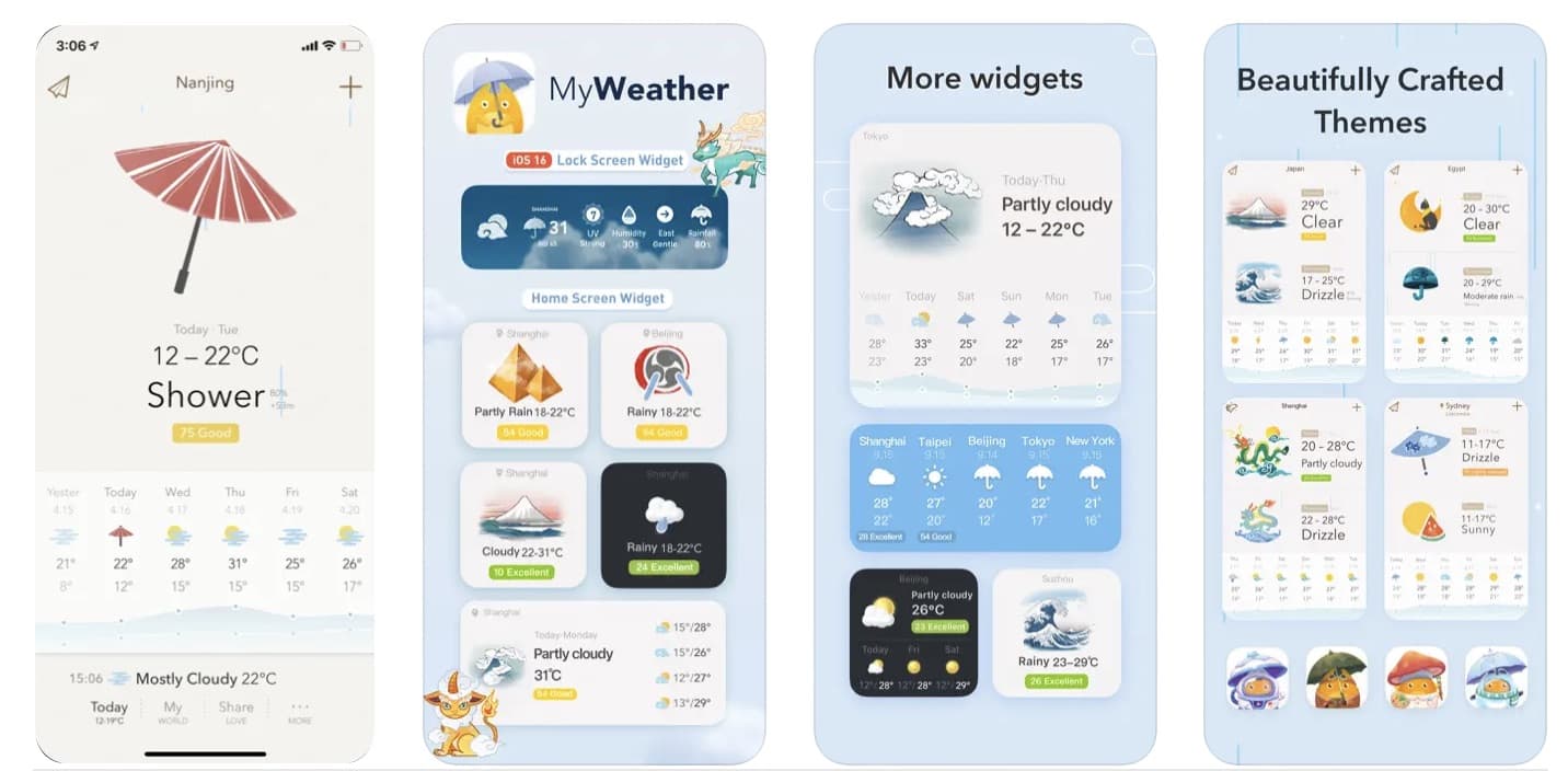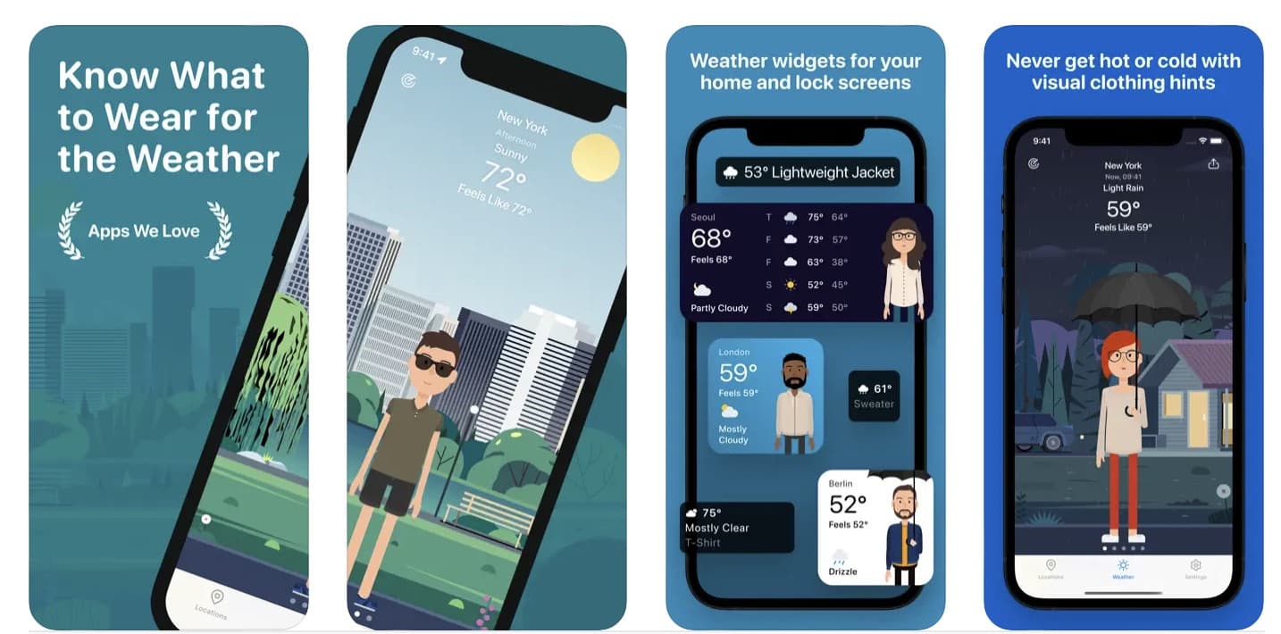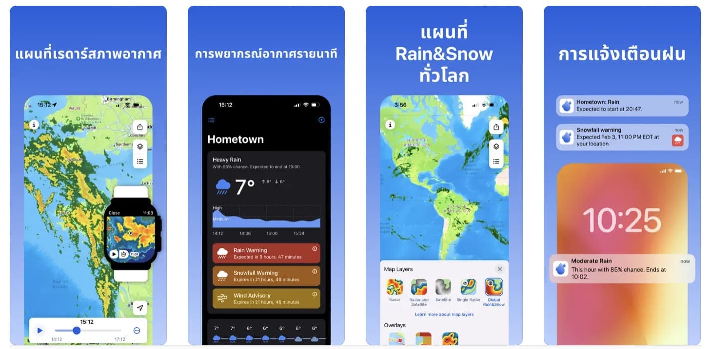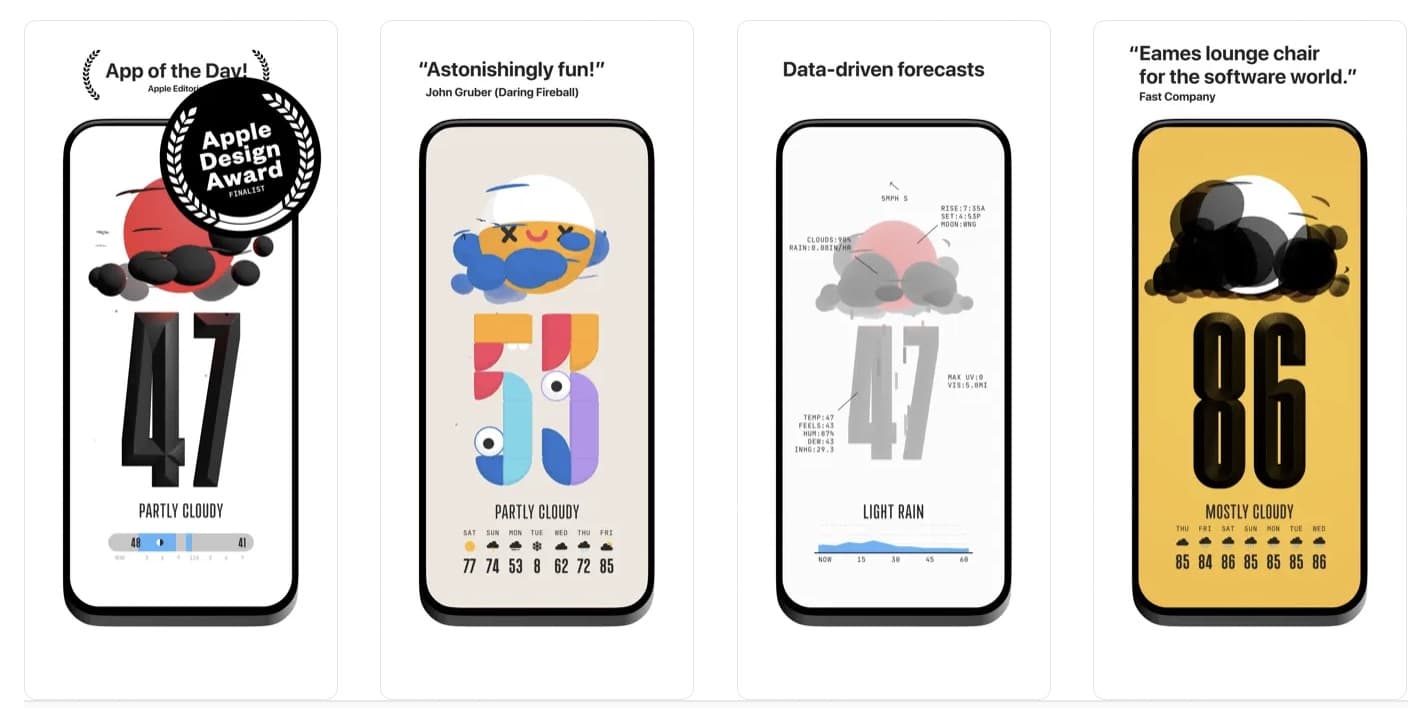ใช้งานง่าย แสดงข้อมูลสภาพอากาศแบบเรียลไทม์ แอปนี้สีสันสวยงาม การออกแบบเมนูน่ารักน่าใช้ แอปนี้มีให้ใช้งานบน Apple Watch ด้วย มาพร้อม UI ที่น่ารักมาก ๆ