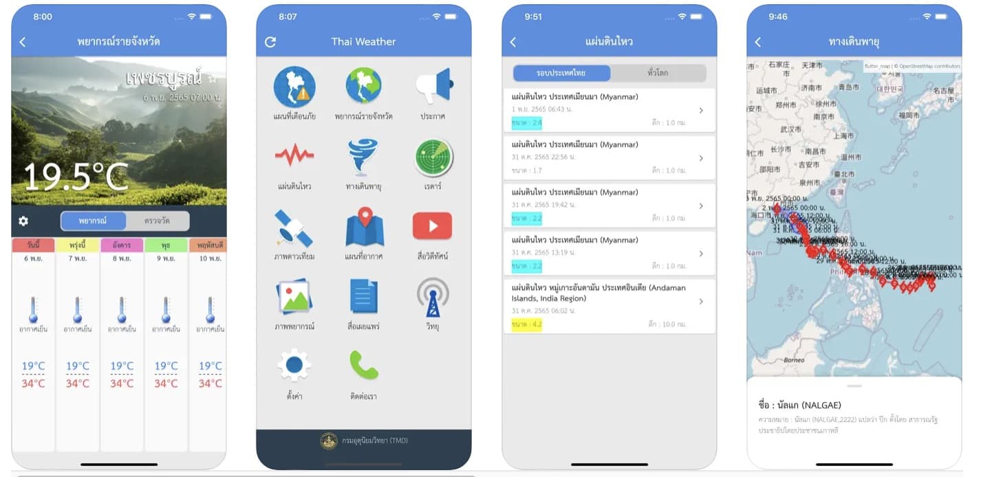 แอปจากกรมอุตุนิยมวิทยา ใช้งานง่าย แสดงข้อมูลสภาพอากาศครบถ้วน รายงานสภาพอากาศของประเทศไทย ประกอบไปด้วย สภาพอากาศปัจจุบัน, พยากรณ์อากาศล่วงหน้า, เส้นทางพายุ, รายงานแผนดินไหว, การแจ้งข่าวสาร, การเตือนภัย, การแจ้งเตือนสภาพอากาศ, สื่อเผยแพร่, เรดาร์สภาพอากาศ, ภาพถ่ายดาวเทียม, แผนที่อากาศ