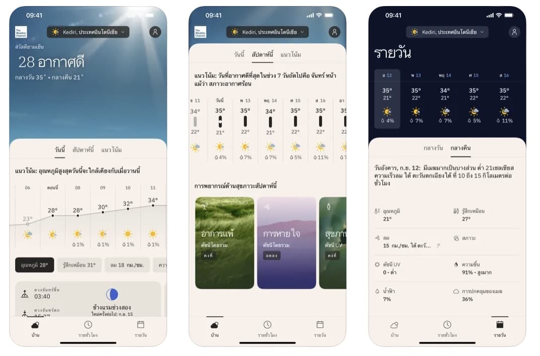 พยากรณ์อากาศล่วงหน้า 15 วัน มีการแจ้งเตือนสภาพอากาศที่เลวร้าย UI ในแอปเป็นมิตร น่ารักหนักมาก เลือกธีมการแสดงผลได้ ใช้ดูสภาพอากาศเรียลไทม์และดูคุณภาพอากาศได้