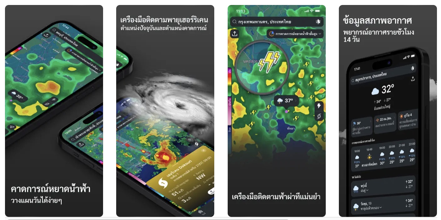 แอปติดตามพายุ เหมาะสำหรับคนที่ดูแผนที่อากาศเป็น สามารถดูได้ทั่วโลก แอปนี้เขามีเรดาร์ความละเอียดสูงแสดงผลก่อนหน้าและย้อนหลัง 8 ชั่วโมง ติดตามกลุ่มพายุล่วงหน้า และการเตือนสภาพอากาศที่รุนแรงแบบเรียลไทม์