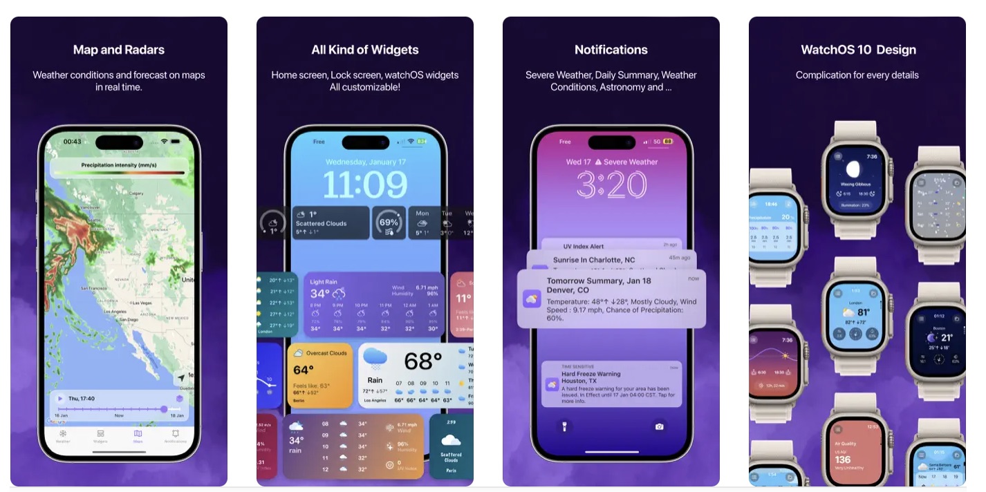 ดูพยากรณ์อากาศท้องถิ่น มีวิดเจ็ตที่ปรับแต่งได้ มีการทำงานบน Live Activity และ Dynamic Island อนิเมชั่นสวยงาม แอปมาในธีมสีม่วง น่าใช้มาก