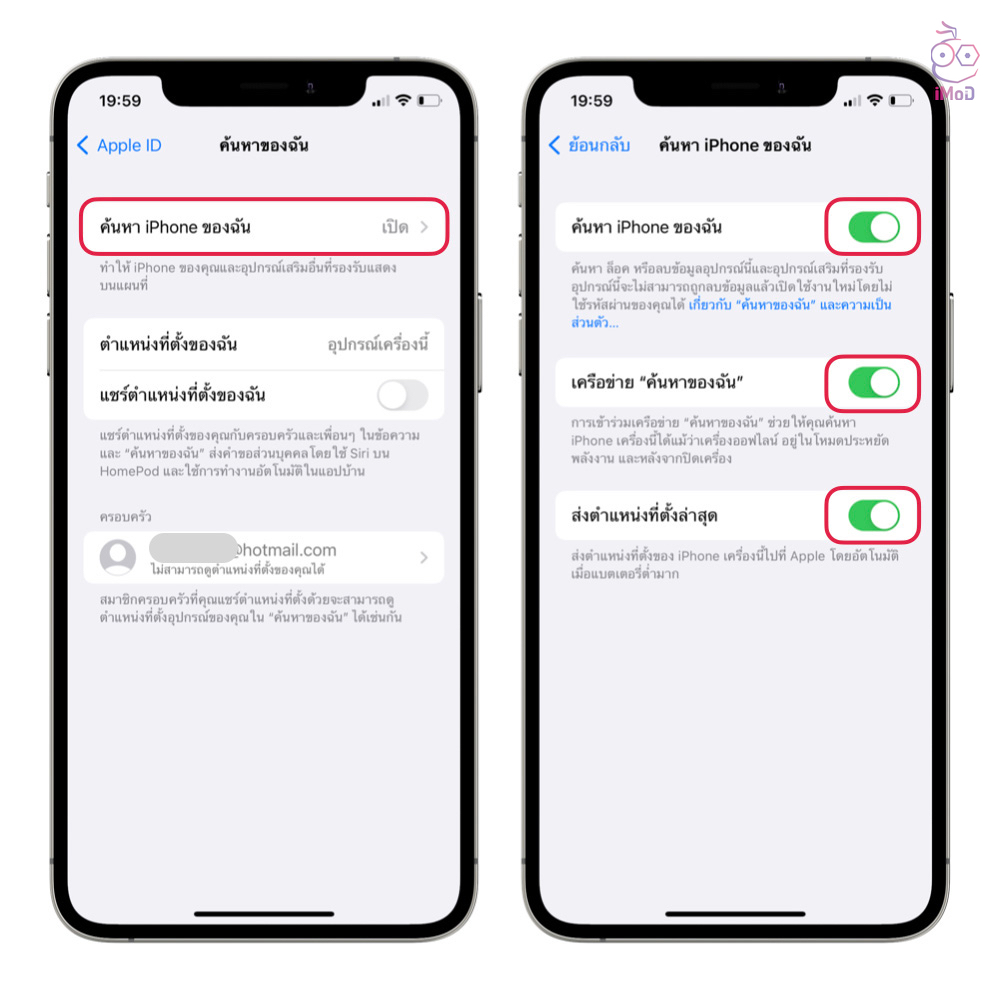 แตะ ค้นหา iPhone ของฉัน (Find My iPhone) > เปิดใช้งาน ค้นหา iPhone ของฉัน (Find My iPhone) และเปิด เครือข่าย “ค้นหาของฉัน” และส่งตำแหน่งที่ตั้งล่าสุดไว้ด้วย