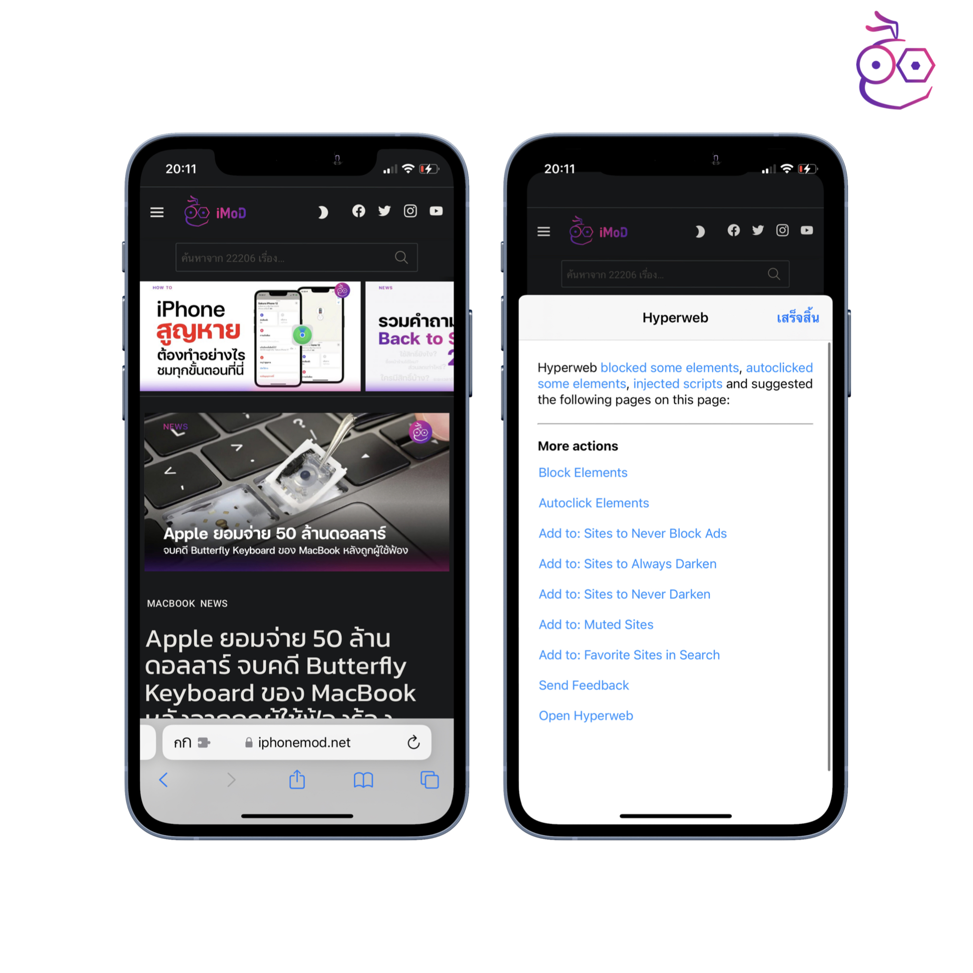 Hyperweb เป็นส่วนขยายที่ให้ผู้ใช้สร้างตัวบล๊อก ปิดการใช้งานคุกกี้ จัดการโหมดมืด และเปิดลิงก์ในแอปเฉพาะ รวมถึงสามารถแทรกสคริปต์ CSS และ JS ได้สำหรับนักพัฒนา