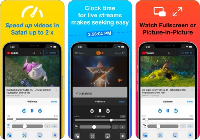 Vidimote for Safari ส่วนขยายที่ช่วยให้ผู้ใช้ควบคุมการเล่นวิดีโอผ่านเว็บบราวเซอร์ Safari ได้ง่ายมากขึ้น มีทั้งการเพิ่มความเร็ว การข้าม การปิดเปิดเสียง และเลือกเป็นโหมด PiP กับโหมดเต็มหน้าจอได้ด้วย รองรับวิดีโอ HTML 5 สามารถเล่นได้ทั้ง YouTube, Netflix, Vimeo, Twitch, Dropbox หรือแพลตฟอร์มอื่นๆ