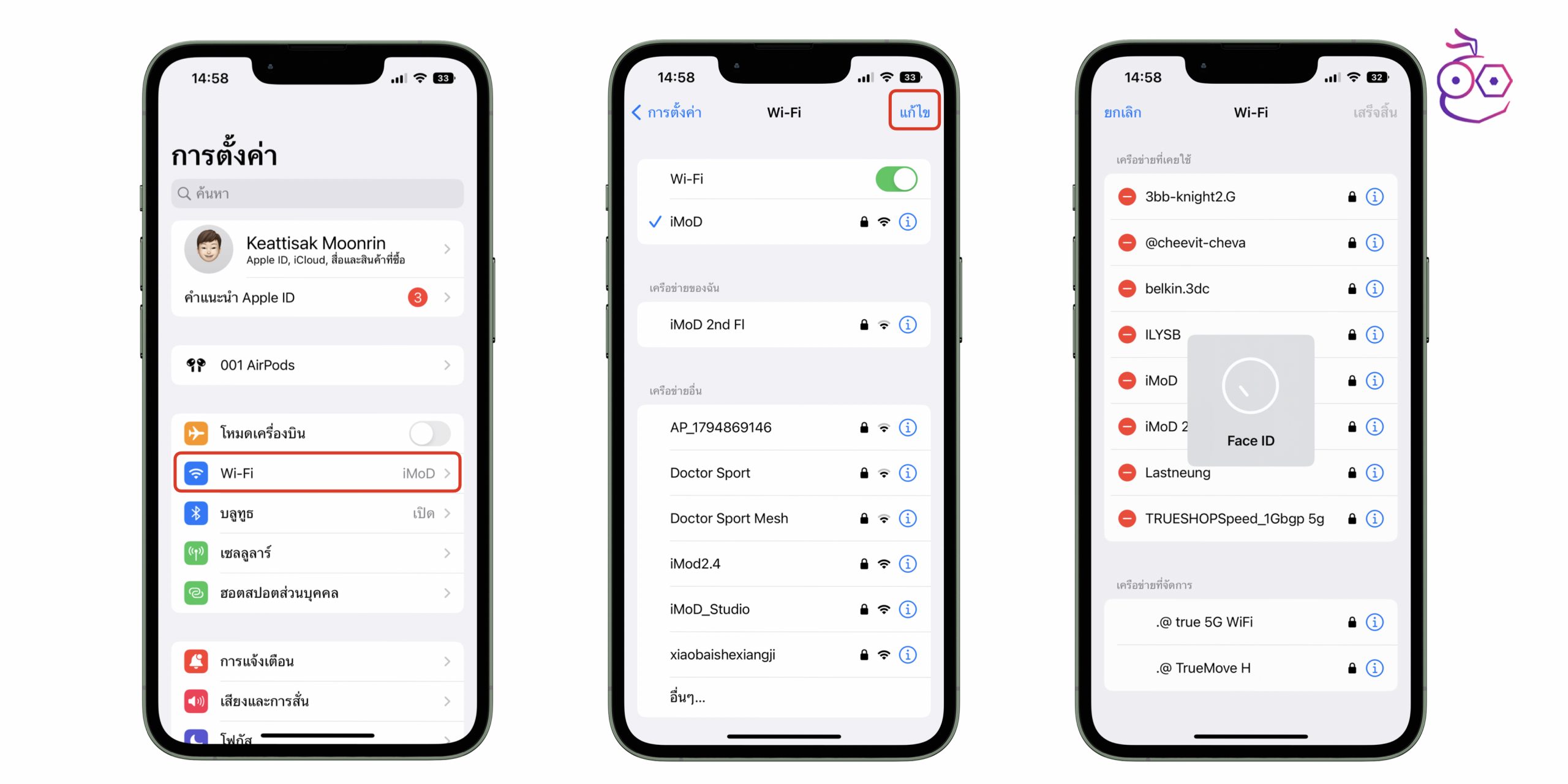 นอกเหนือจากการดูรหัสผ่าน Wi-Fi ที่เชื่อมต่อแล้ว เรายังสามารถกดดู รายชื่อ Wi-Fi ที่เคยเชื่อมต่อเอาไว้ได้ทั้งหมดอีกด้วย โดยเข้าไปที่ การตั้งค่า > Wi-Fi > แก้ไข > (ใช้การยืนยันตน Face ID และ Touch ID ในการเข้าดู)