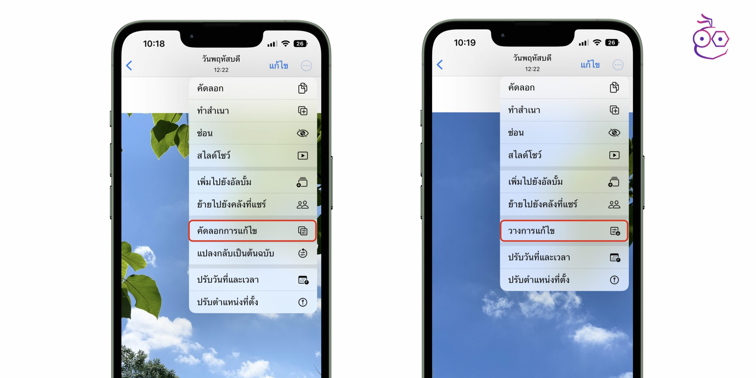โดยกดที่ปุ่มสามจุด ด้านขวาบน เลือก “คัดลอกการแก้ไข” และ “วางการแก้ไข”