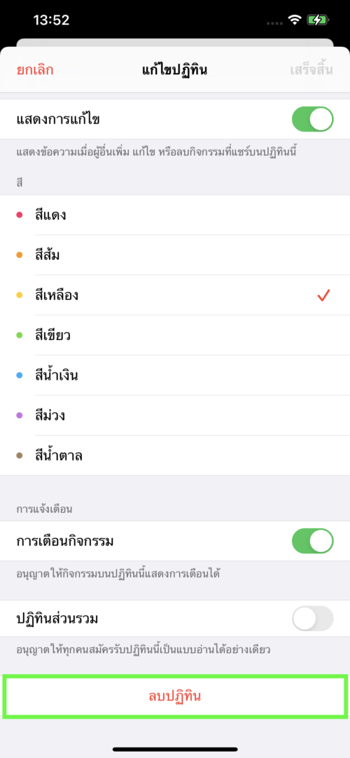 เข้าไปที่แอปปฏิทิน (Calendar) > เลือกปฏิทิน > เลือกปฏิทินที่แชร์แล้วแตะข้อมูลเพื่อดูว่าเราแชร์ปฏิทินกับใครบ้าง หากเราเป็นเจ้าของปฏิทินให้แตะที่ชื่อของสมาชิกเพื่อดูตัวเลือกในการนำออก หากเราเป็นสมาชิกเราสามารถแตะลบปฏิทินจากด้านล่างของหน้าจอได้