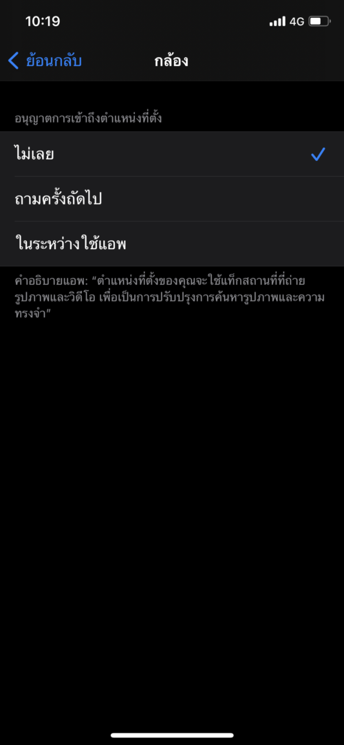 หากแอปไหนที่ไม่จำเป็นต้องใช้การอนุญาตตำแหน่งที่ตั้ง เช่นแอปกล้อง เราสามารถเลือกไม่ให้สิทธิ์การเข้าถึงตำแหน่งที่ตั้งของเราได้
