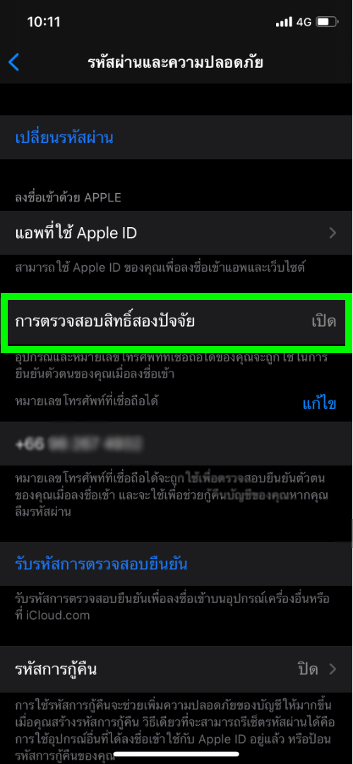 เข้าไปที่ การตั้งค่า (Setting) > แตะตรงชื่อของเราที่ด้านบนสุด > รหัสผ่านและความปลอดภัย (Password & Security) > เปิดการตรวจสอบสิทธิ์ 2 ปัจจัย (Turn On Two-Factor Authentication) > ต่อไป (Continue) > ใส่เบอร์โทรศัพท์ที่จะใช้รับรหัสยืนยันเมื่อเราทำการลงชื่อเข้าใช้ (สามารถเลือกได้ว่าจะรับโค้ดผ่านทางข้อความหรือการโทรเข้าเครื่อง) > แตะต่อไป (Next) > ใส่รหัสยืนยันที่ได้รับเพื่อเปิดการตรวจสอบสิทธิ์ 2 ปัจจัย