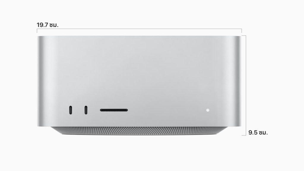 Mac Studio เป็นคอมพิวเตอร์ตั้งโต๊ะที่มีดีไซน์คล้าย ๆ กับ Mac mini แต่มีความสูงมากกว่า สำหรับพื้นที่เก็บฮาร์ดแวร์ที่ทรงพลังและระบบระบายความร้อนอย่างดีอยู่ภายใน
