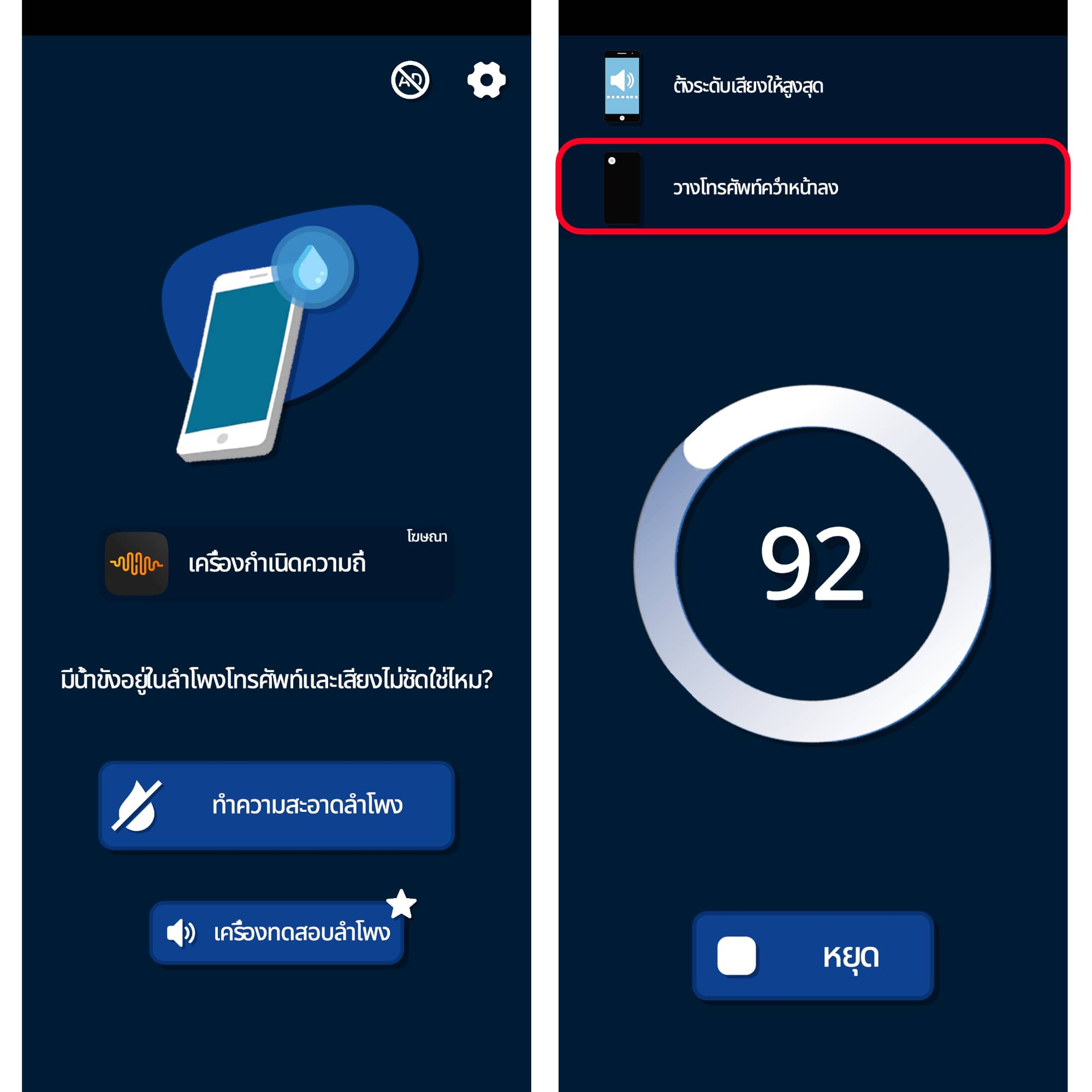 วิธีใช้งานก็ง่ายมาก ๆ พอเราเข้าไปที่แอปให้กด “ทำความสะอาดลำโพง” จากนั้นให้คว่ำหน้าจอโทรศัพท์ของเราแล้วรอสักพักจนกว่าน้ำจะออกจากโทรศัพท์จนหมด