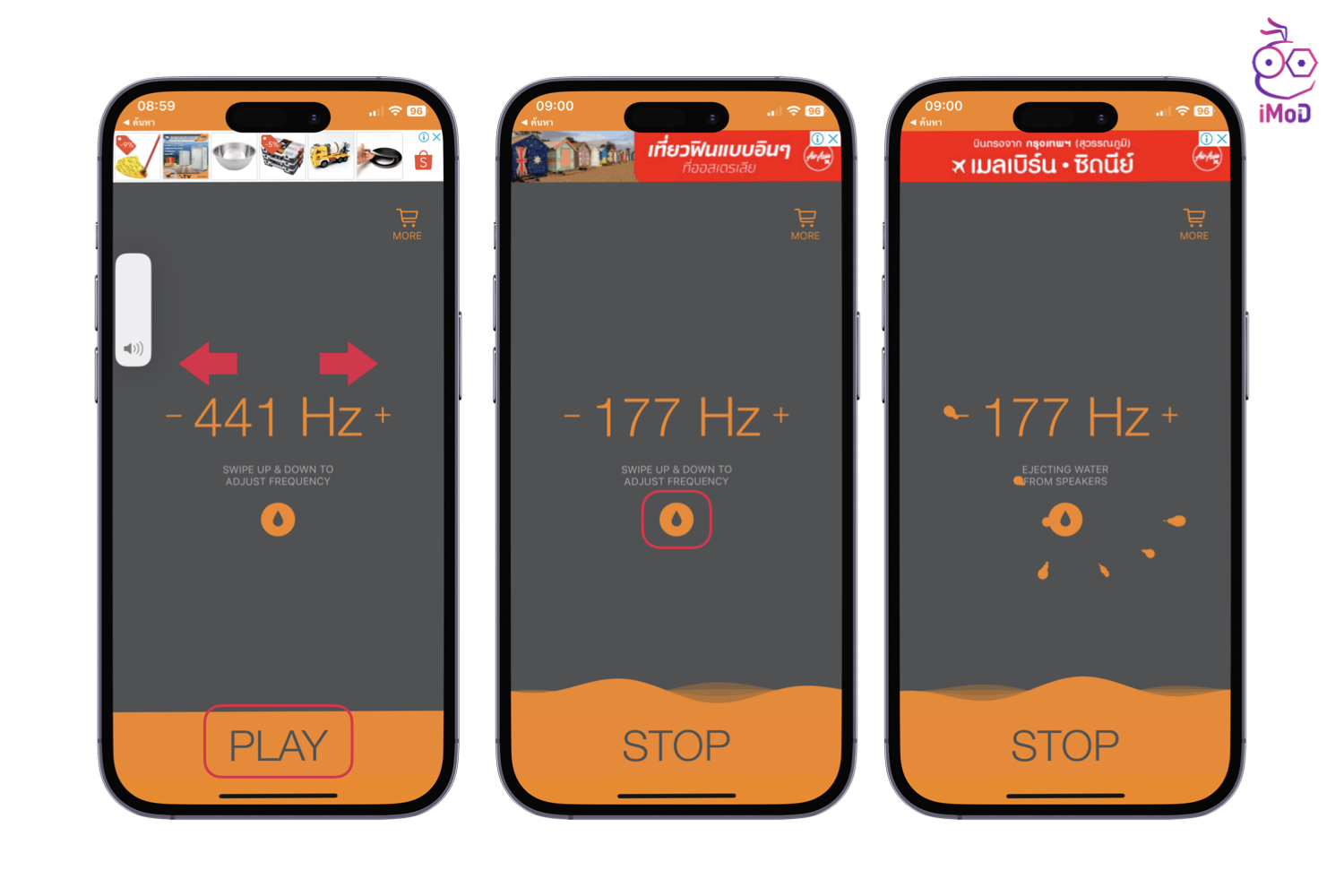 • ถ้าหากน้ำยังไม่หยดออก ให้แตะไอคอนหยดน้ำ เพื่อใช้ความถี่ที่เหมาะสมเพื่อไล่น้ำออก