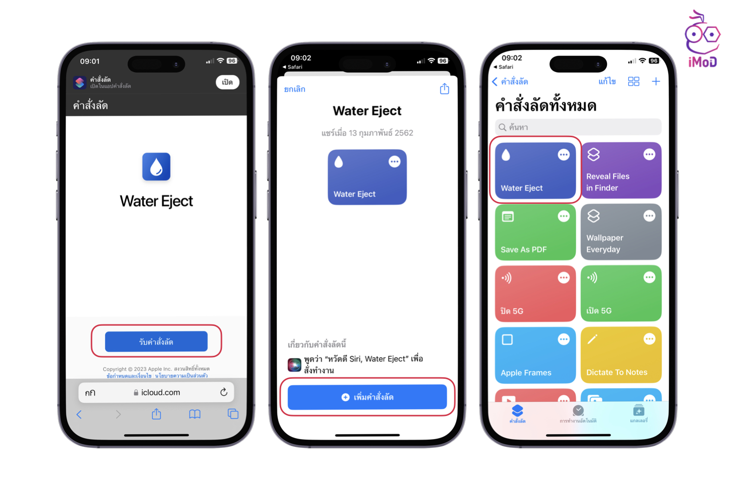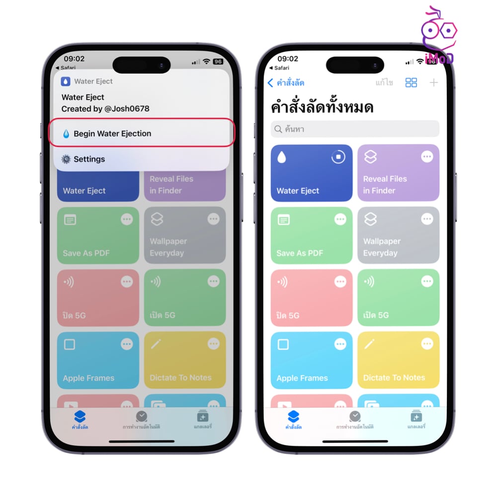 วิธีนี้เราจะใช้คำสั่งลัด Josh0678 [แตะที่นี่เพื่อเปิดคำสั่งลัด] แนะนำเปิดคำสั่งลัดใน Safari แล้วเลือก รับคำสั่งลัด > เพิ่มคำสั่งลัด > เปิดแอปคำสั่งลัด (Shortcuts) ขึ้นมา แล้วแตะที่คำสั่งลัด Water Eject