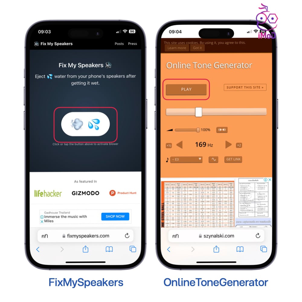 เปิดเว็บไซต์ผ่านเบราเซอร์ Safari จากนั้นก็แตะเล่นเสียงความถี่เพื่อไล่น้ำออกจากลำโพงได้เลย สำหรับเว็บไซต์ OnlineToneGenerator แนะนำให้ปรับความถี่ 160Hz – 200Hz และปรับระดับเสียงลำโพงให้ดัง