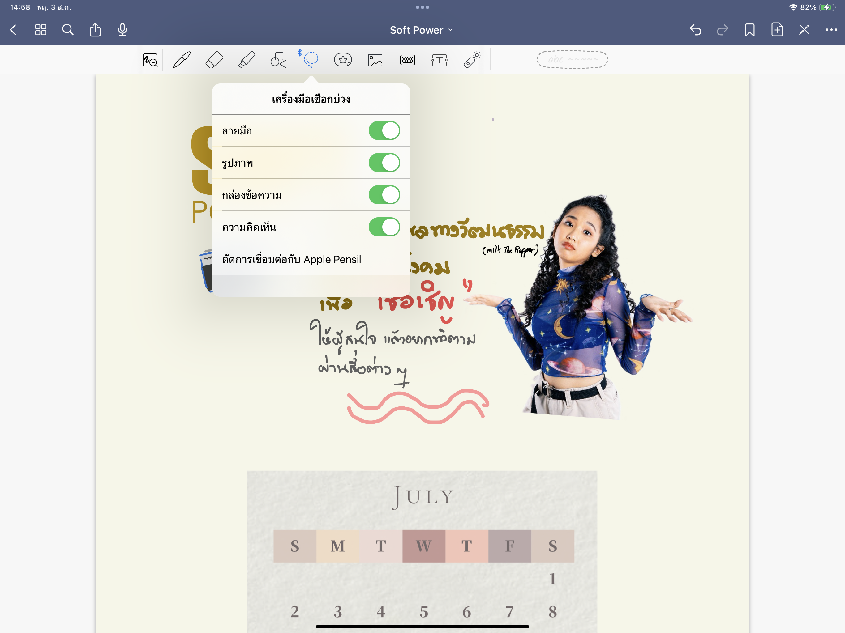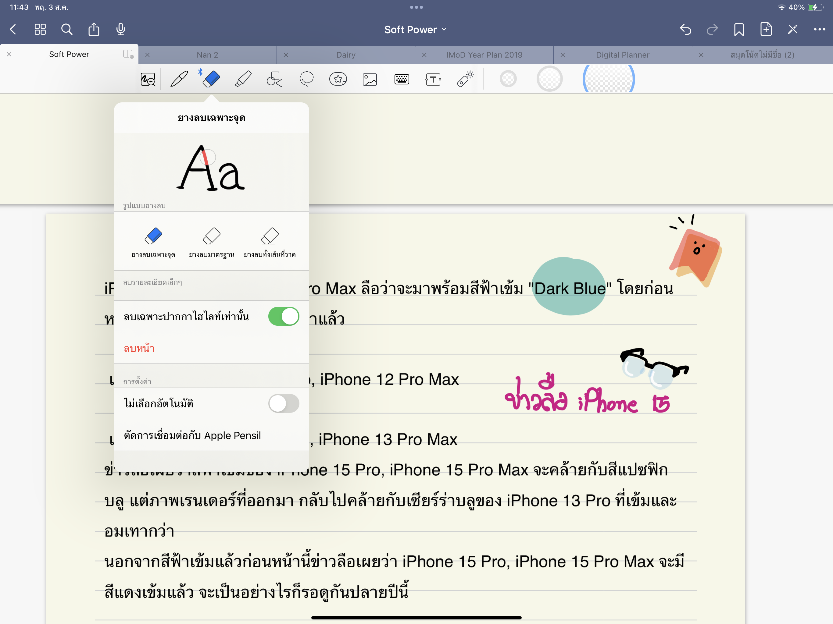 เวลาที่จดหรือเขียนโน้ตลงไปพร้อมกับปากกาไลท์ บางครั้งก็อยากจะลบแค่ปากกาไฮไลท์ก็สามารถเข้าไปเปิดการตั้งค่าได้โดย เลื่อนเปิด “ลบเฉพาะปากกาไฮไลท์เท่านั้น”