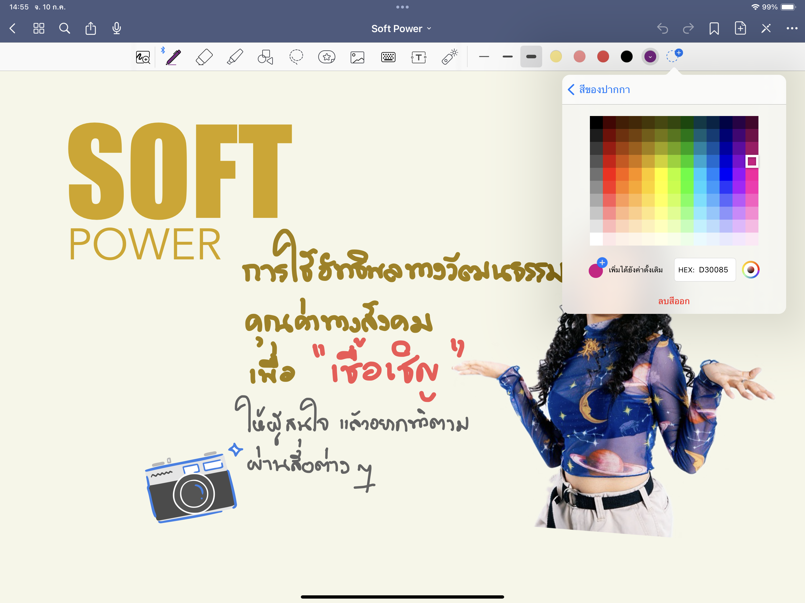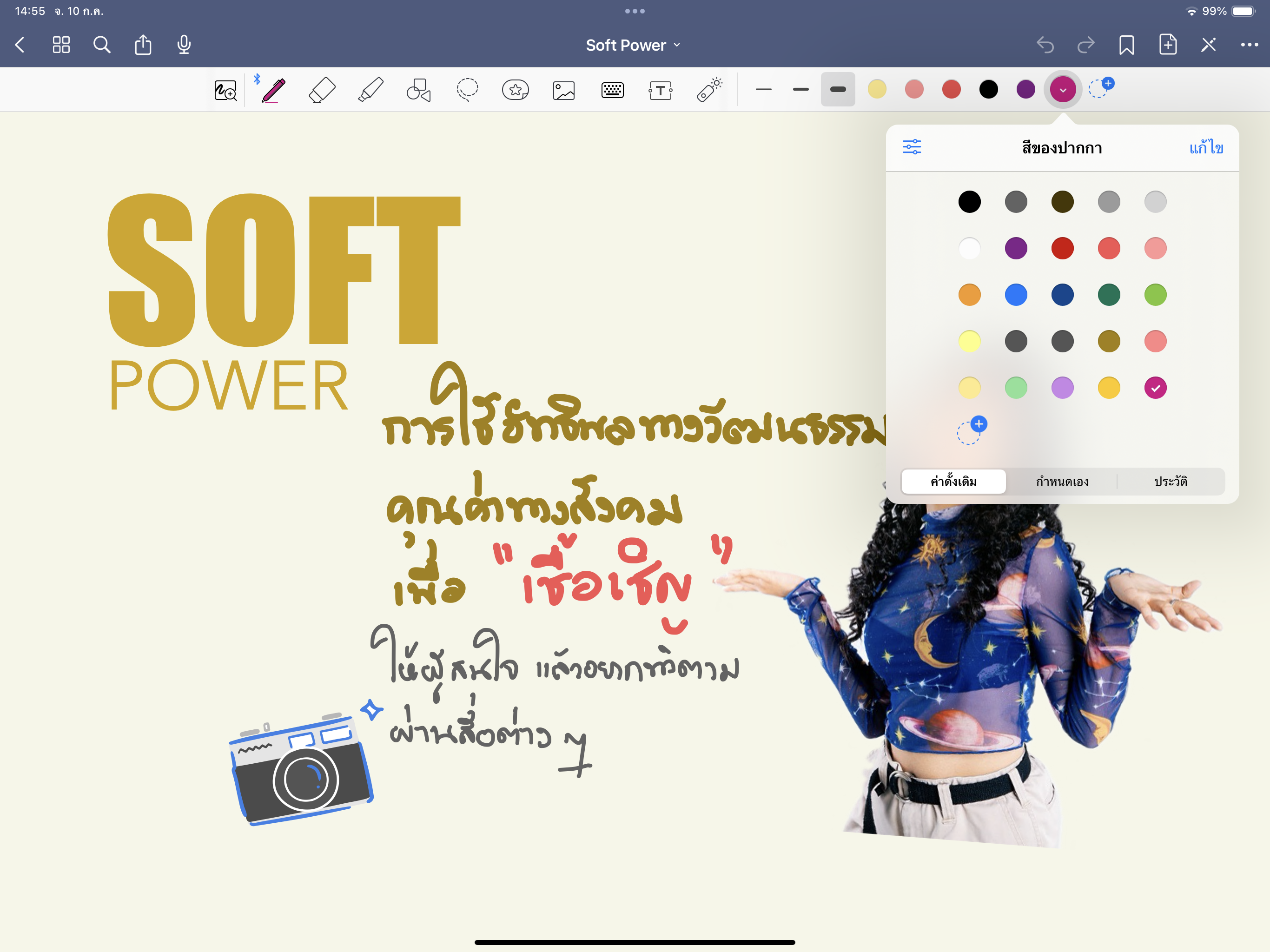 หากมีสีปากกาที่ชอบหรือใช้เป็นประจำอยู่แล้วก็สามารถเพิ่มไว้ในแถบเครื่องมือด้านบนได้เลย ไม่ต้องเสียเวลาหาสีปากกาเวลาจดโน้ต วิธีการคือ แตะที่ช่องเครื่องหมายบวก > เลือกสีที่ต้องการ > สีก็จะไปปรากฎบนแถบเครื่องมือ