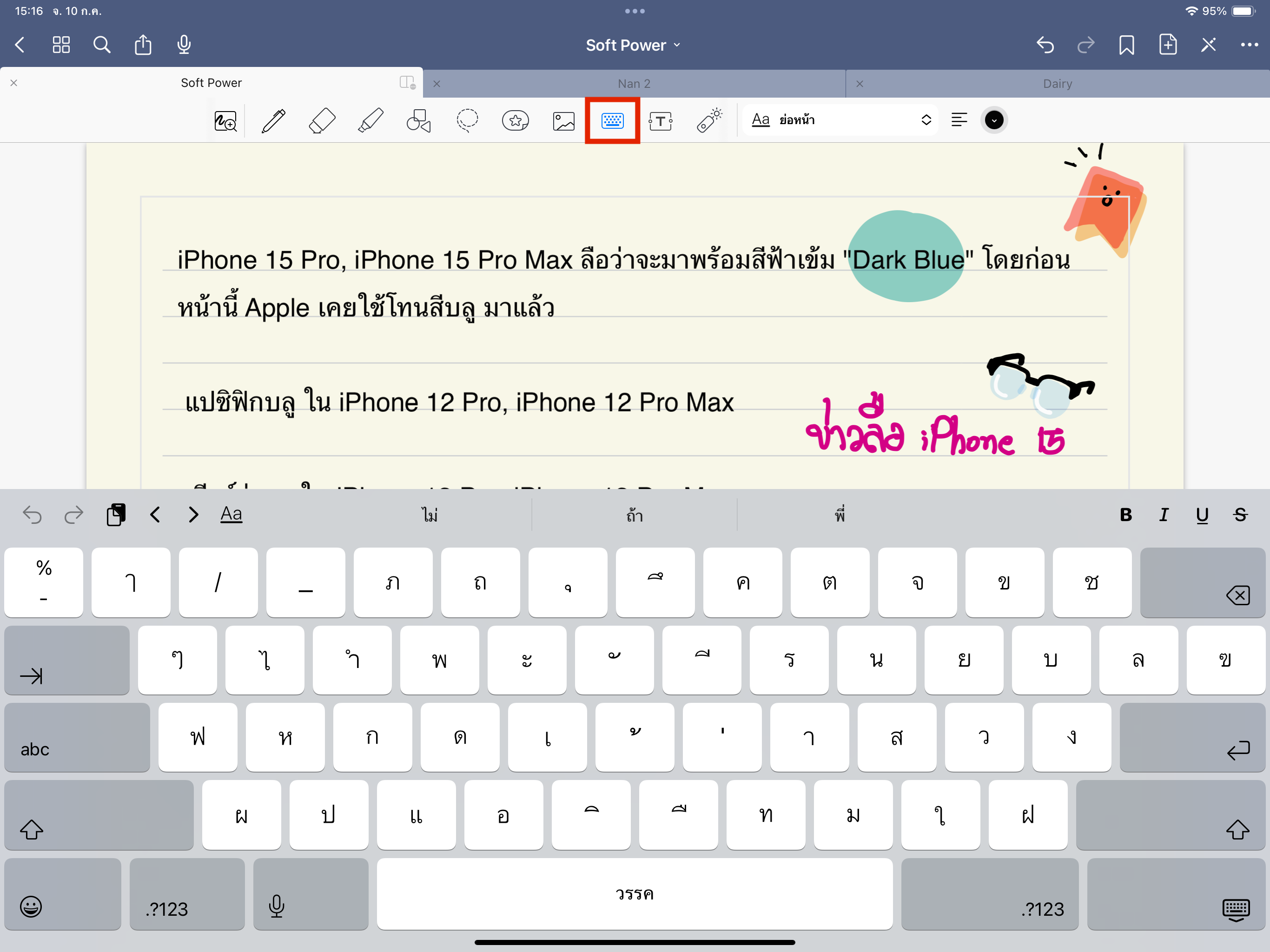 เราสามารถพิมพ์ข้อความเสมือนงานเอกสารได้ในแอป GoodNotes เพียงแค่แตะที่ไอคอนรูปแป้นพิมพ์ โดยฟีเจอร์นี้จะขึ้นบรรทัดใหม่ให้โดยอัตโนมัติ และสามารถจดโน้ต ไฮไลท์ หรือใช้ร่วมกับฟีเจอร์ Scribble เพิ่มเติมได้ด้วย