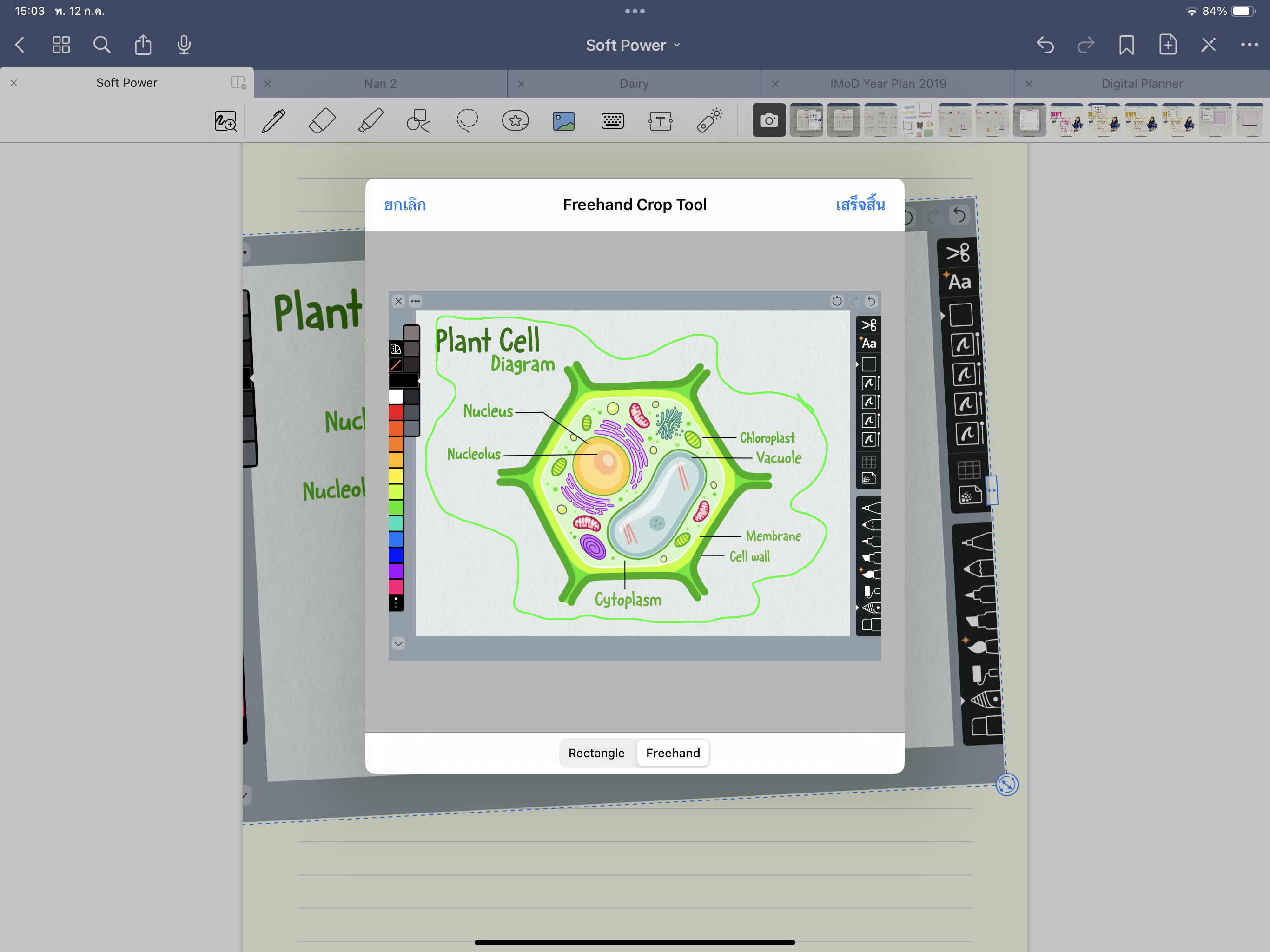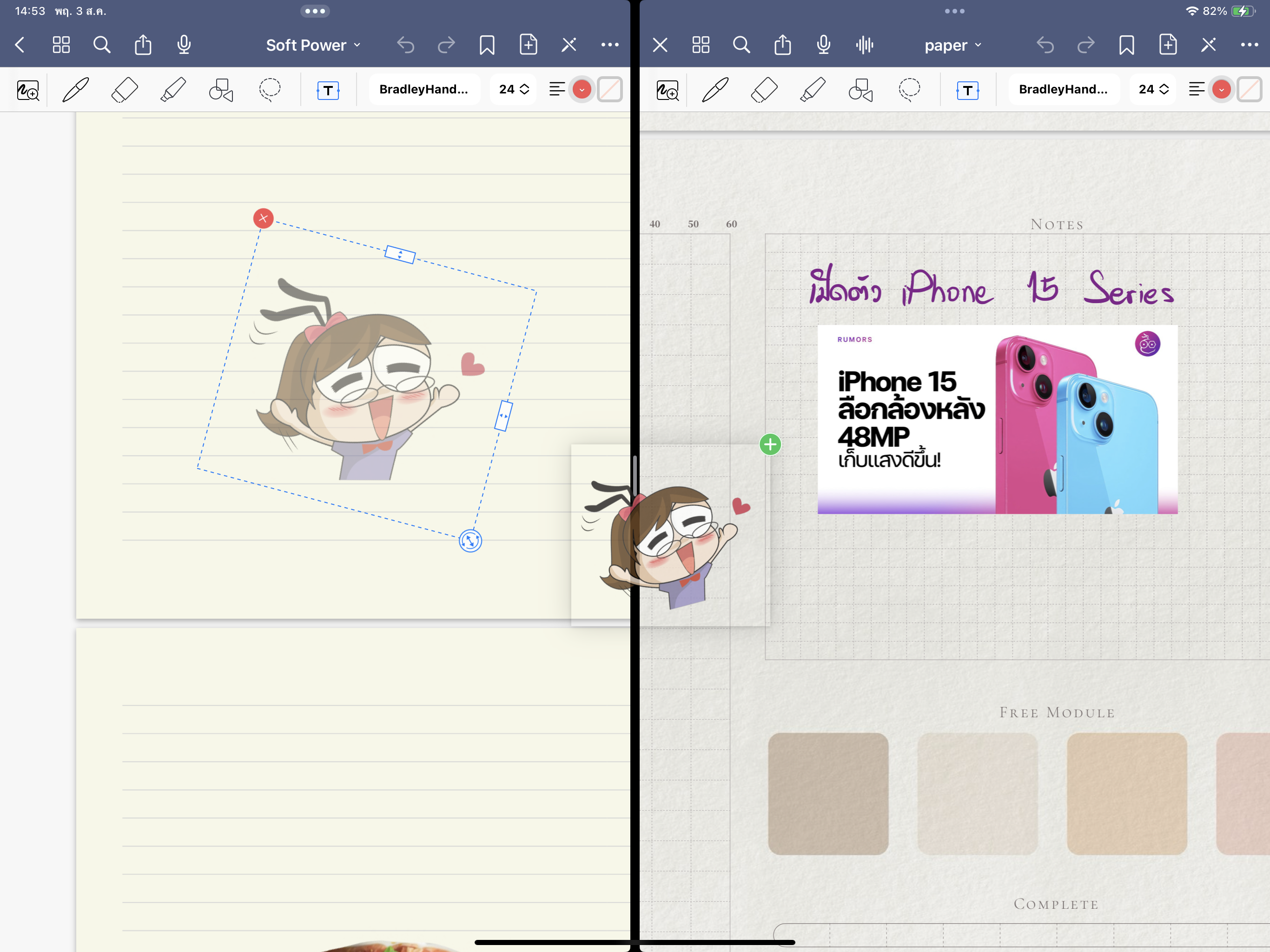 ใช้เครื่องมือ Lasso เลือกส่วนที่ต้องการ > แตะ 1 ครั้ง > เลือก “ถ่ายรูปหน้าจอ” > แตะไอคอนแชร์ จากนั้นกลับไปโน้ตที่กำลังใช้งาน > แตะค้างที่หน้าจอ 1 ครั้ง > เลือก “วาง”