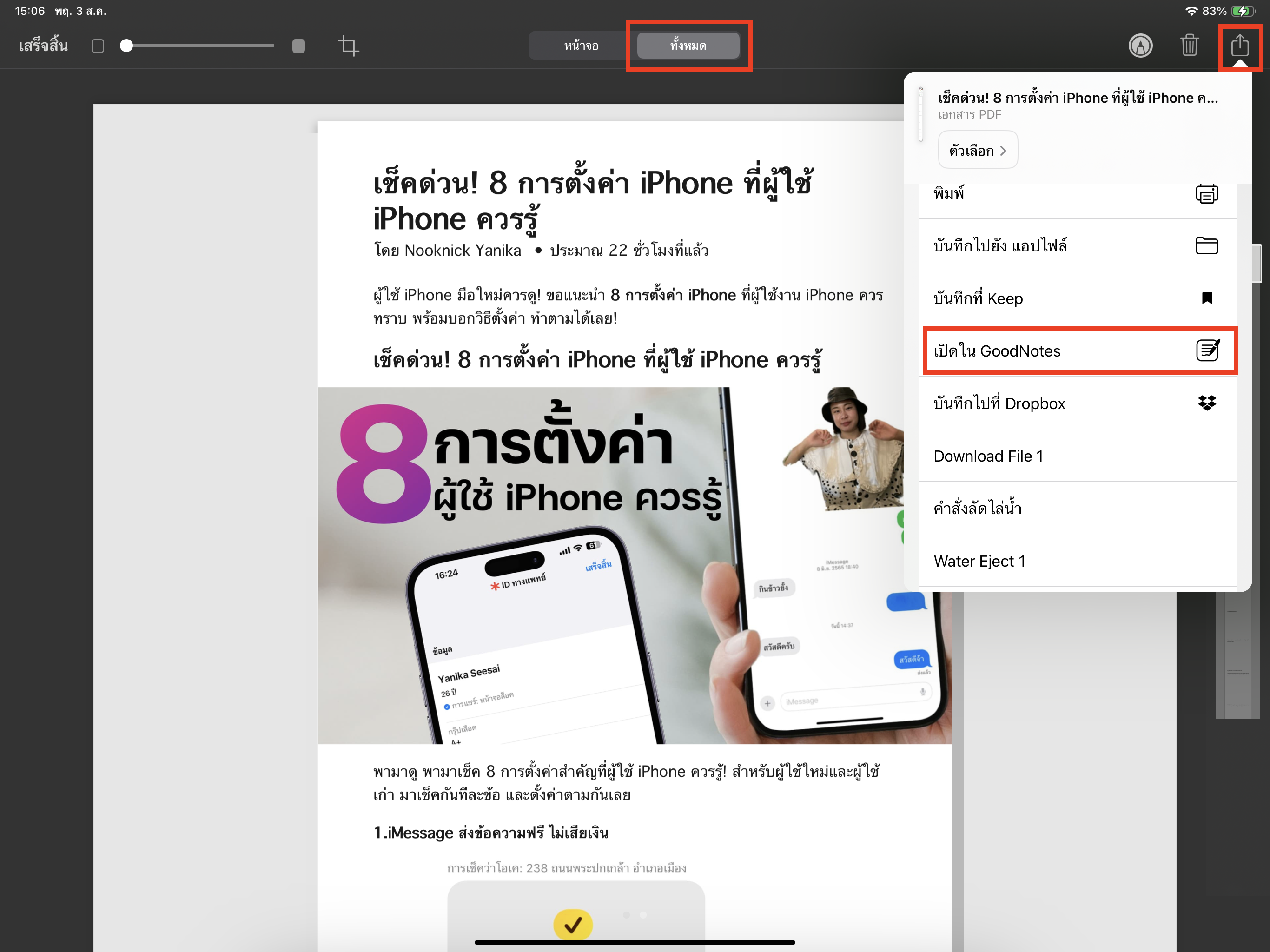 ในช่องตัวเลือก ให้เลือกเป็น “เอกสาร PDF” > เปิดใน GoodNotes > เพิ่มเอกสารจดโน้ตสาระสำคัญต่อได้เลย