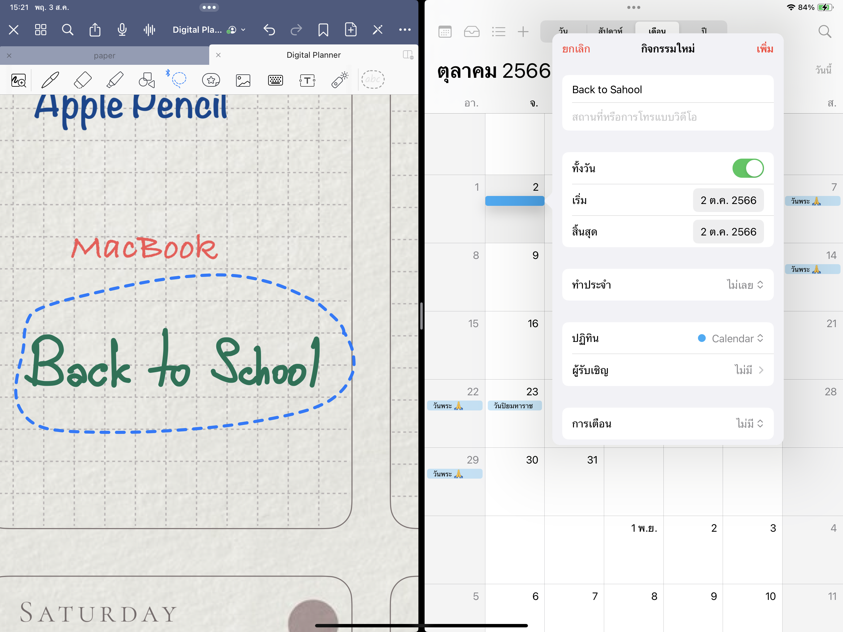 สามารถลากวางตัวหนังสือที่เราเขียนโน้ตไปยังแอปอื่นได้ เช่น เพิ่มกิจกรรมในแอปปฏิทิน