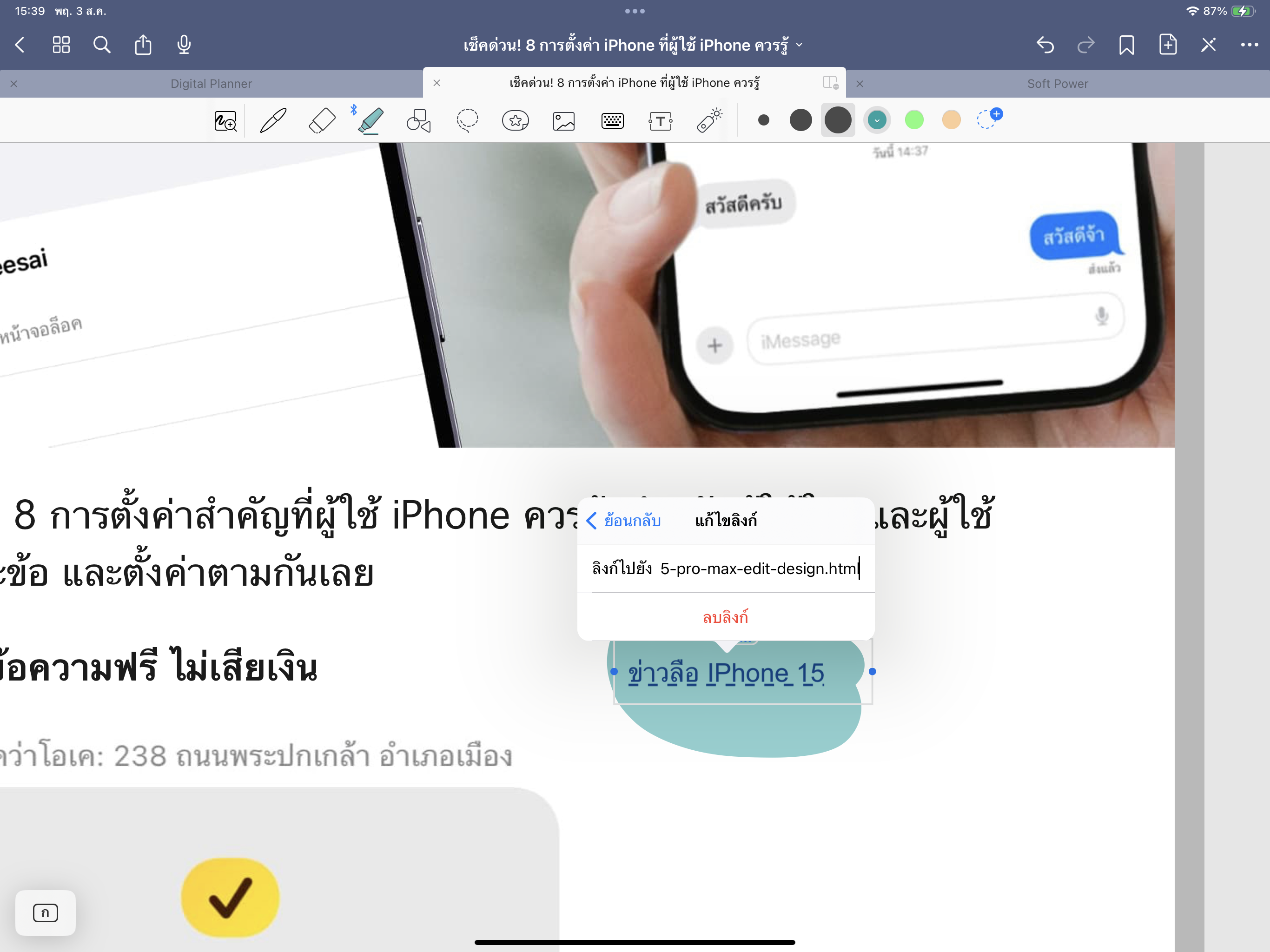 หากต้องการแปะลิงค์บนตัวหนังสือเอาไว้ค้นหาข้อมูลเพิ่มเติมหรือแปะที่มาของข้อมูลก็สามารถฝังลิงค์ได้ เลือกตัวหนังสือที่ต้องการ > ลิงค์ > วาง URL ที่ต้องการแปะ