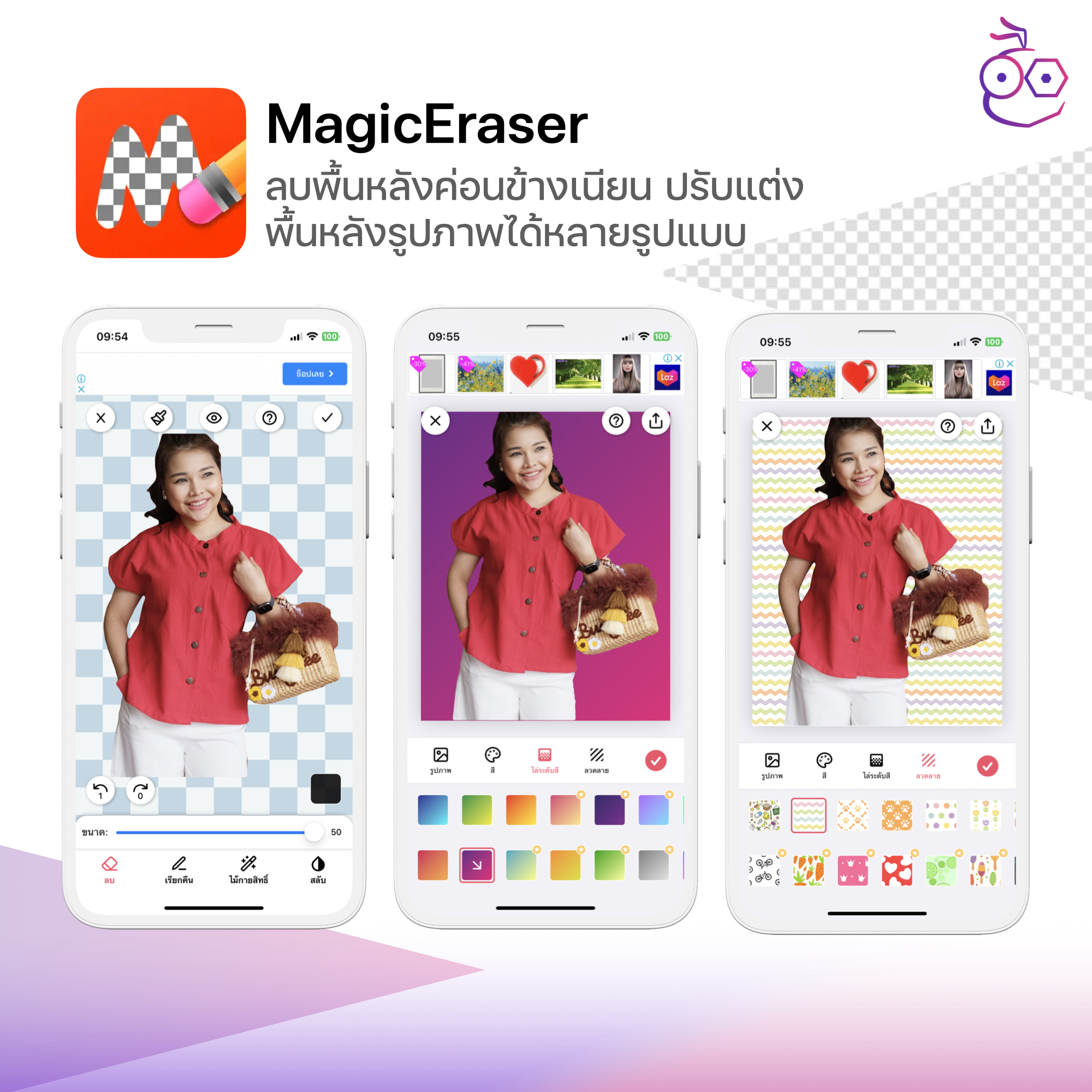แอป MagicEraser สามารถลบพื้นหลังอัตโนมัติได้เนียนมาก และสามารถปรับแต่งการลบพื้นหลังได้อย่างละเอียด กำหนดพื้นที่ที่ต้องการลบได้เอง และเลือกปรับแต่งสีพื้นหลังได้ [ดาวน์โหลดแอปที่นี่]